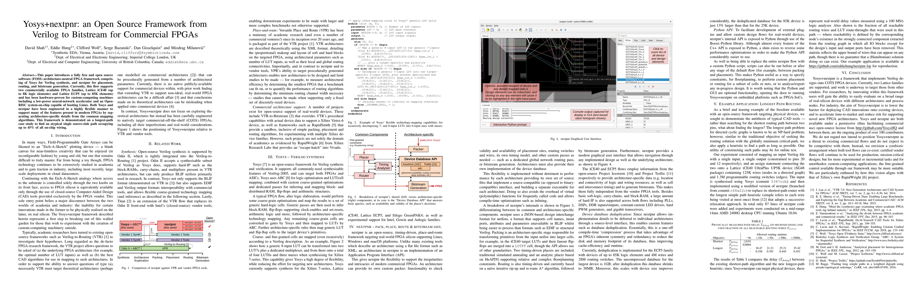 This paper introduces a fully free and open source software (FOSS) architecture-neutral FPGA framework comprising of Yosys for Verilog synthesis, and nextpnr for placement, routing, and bitstream generation. Currently, this flow supports two commercially available FPGA families, Lattice iCE40 (up to 8K logic elements) and Lattice ECP5 (up to 85K elements) and has been hardware-proven for custom-computing machines including a low-power neural-network accelerator and an OpenRISC system-on-chip capable of booting Linux. Both Yosys and nextpnr have been engineered in a highly flexible manner to support many of the features present in modern FPGAs by separating architecture-specific details from the common mapping algorithms. This framework is demonstrated on a longest-path case study to find an atypical single source-sink path occupying up to 45% of all on-chip wiring.