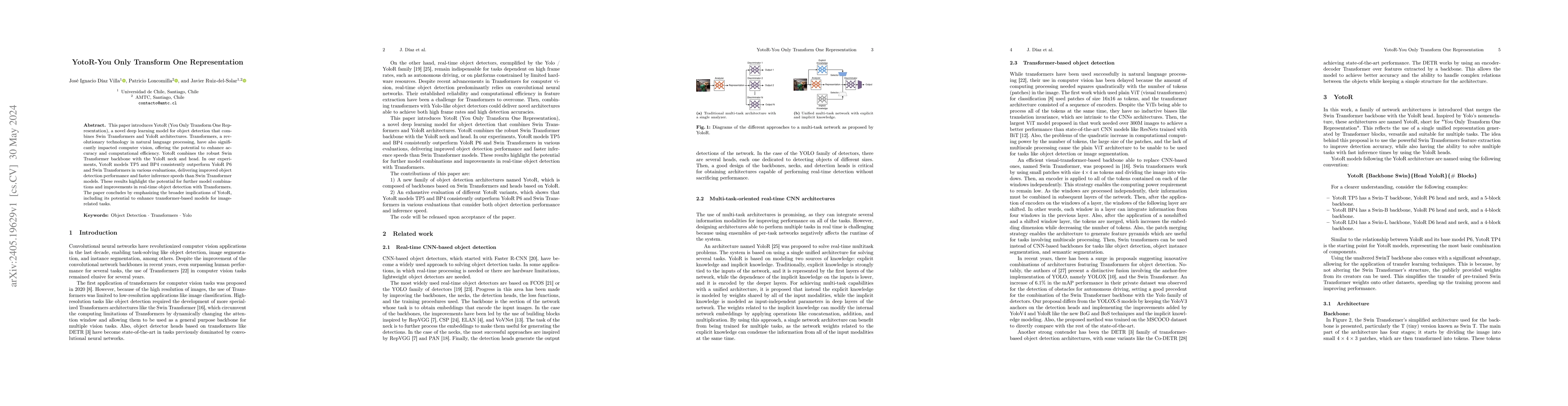 This paper introduces YotoR (You Only Transform One Representation), a novel deep learning model for object detection that combines Swin Transformers and YoloR architectures. Transformers, a revolutionary technology in natural language processing, have also significantly impacted computer vision, offering the potential to enhance accuracy and computational efficiency. YotoR combines the robust Swin Transformer backbone with the YoloR neck and head. In our experiments, YotoR models TP5 and BP4 consistently outperform YoloR P6 and Swin Transformers in various evaluations, delivering improved object detection performance and faster inference speeds than Swin Transformer models. These results highlight the potential for further model combinations and improvements in real-time object detection with Transformers. The paper concludes by emphasizing the broader implications of YotoR, including its potential to enhance transformer-based models for image-related tasks.