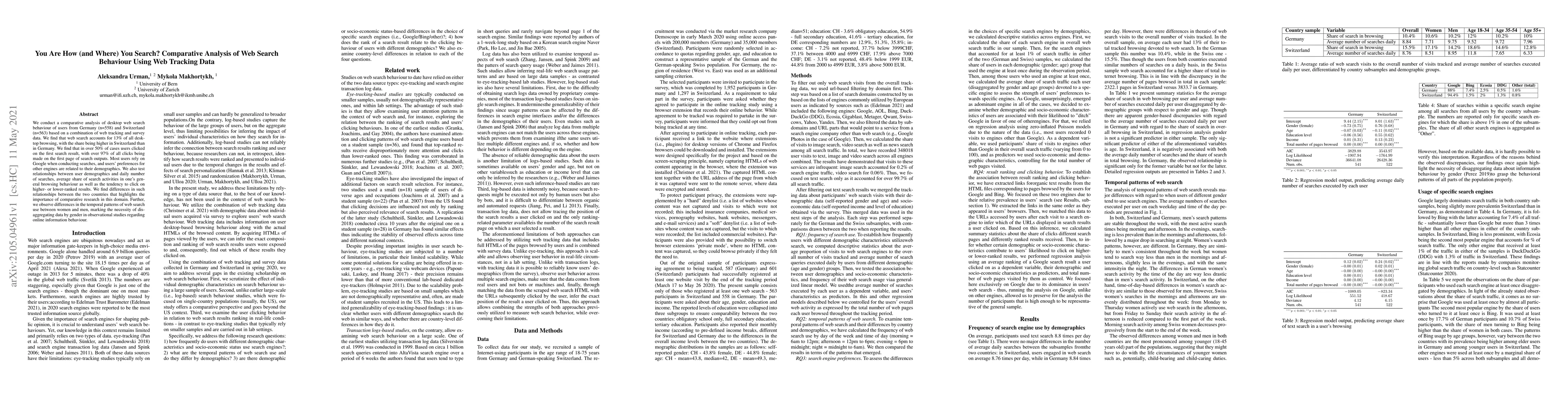 Web search behavior shows significant differences between Germany and Switzerland, with users favoring Google and relying heavily on first-page results. Gender also influences web search patterns, with women showing unique temporal patterns of use.