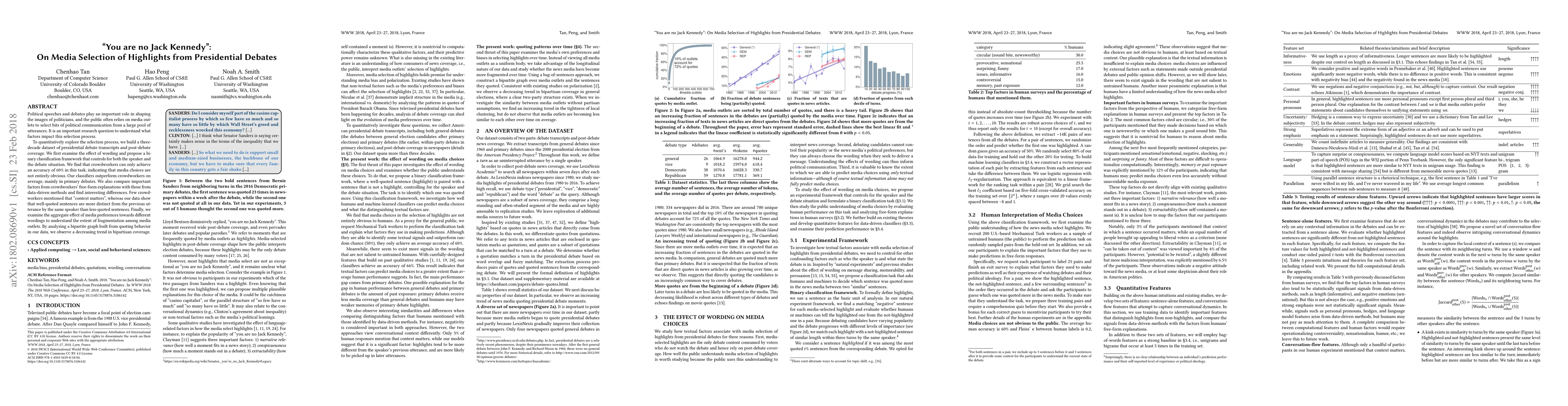 Political speeches and debates play an important role in shaping the images of politicians, and the public often relies on media outlets to select bits of political communication from a large pool of utterances. It is an important research question to understand what factors impact this selection process. To quantitatively explore the selection process, we build a three- decade dataset of presidential debate transcripts and post-debate coverage. We first examine the effect of wording and propose a binary classification framework that controls for both the speaker and the debate situation. We find that crowdworkers can only achieve an accuracy of 60% in this task, indicating that media choices are not entirely obvious. Our classifiers outperform crowdworkers on average, mainly in primary debates. We also compare important factors from crowdworkers' free-form explanations with those from data-driven methods and find interesting differences. Few crowdworkers mentioned that "context matters", whereas our data show that well-quoted sentences are more distinct from the previous utterance by the same speaker than less-quoted sentences. Finally, we examine the aggregate effect of media preferences towards different wordings to understand the extent of fragmentation among media outlets. By analyzing a bipartite graph built from quoting behavior in our data, we observe a decreasing trend in bipartisan coverage.