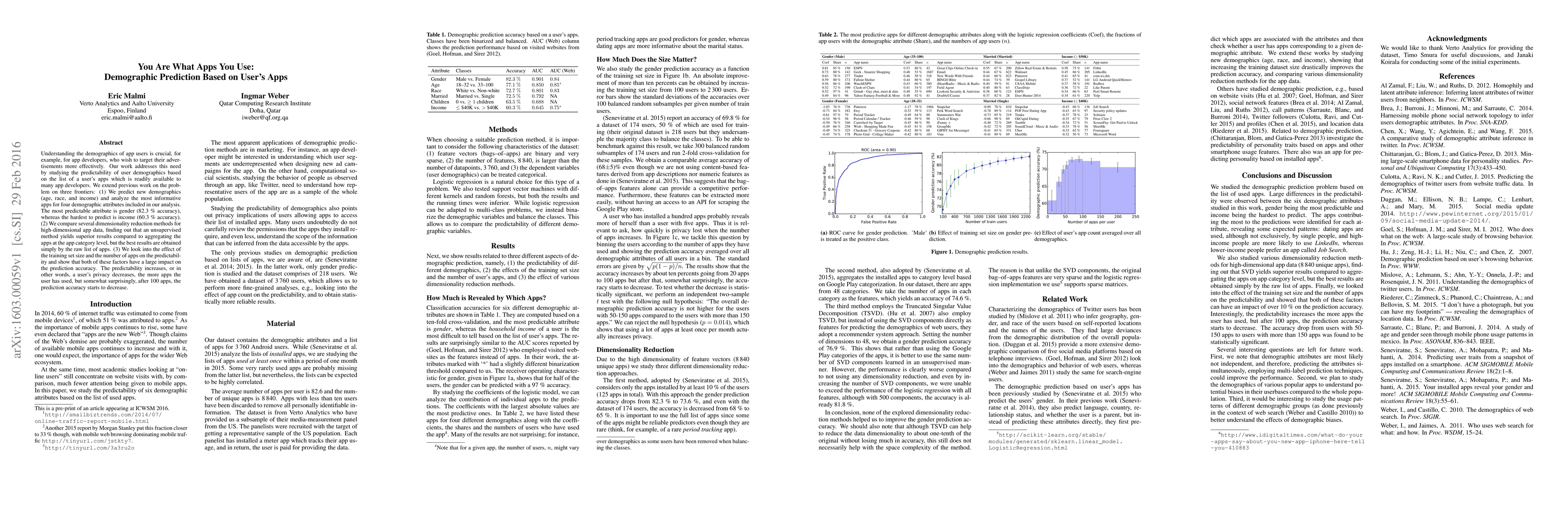 A study found that a user's app usage can predict their demographics with high accuracy, with gender being the most predictable attribute (82.3%), while income was the hardest to guess (60.3%). The study also showed that having more apps used by a user increases prediction accuracy up to 100 apps.