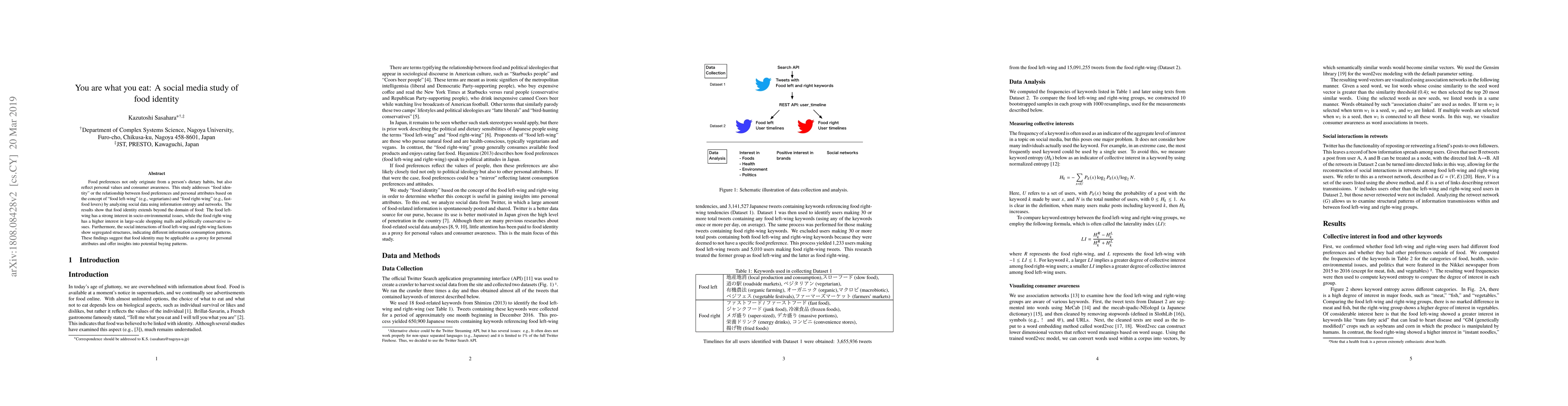 Food preferences not only originate from a person's dietary habits, but also reflect personal values and consumer awareness. This study addresses `food identity' or the relationship between food preferences and personal attributes based on the concept of `food left-wing' (e.g., vegetarians) and `food right-wing' (e.g., fast-food lovers) by analyzing social data using information entropy and networks. The results show that food identity extends beyond the domain of food: The food left-wing has a strong interest in socio-environmental issues, while the food right-wing has a higher interest in large-scale shopping malls and politically conservative issues. Furthermore, the social interactions of food left-wing and right-wing factions show segregated structures, indicating different information consumption patterns. These findings suggest that food identity may be applicable as a proxy for personal attributes and offer insights into potential buying patterns.