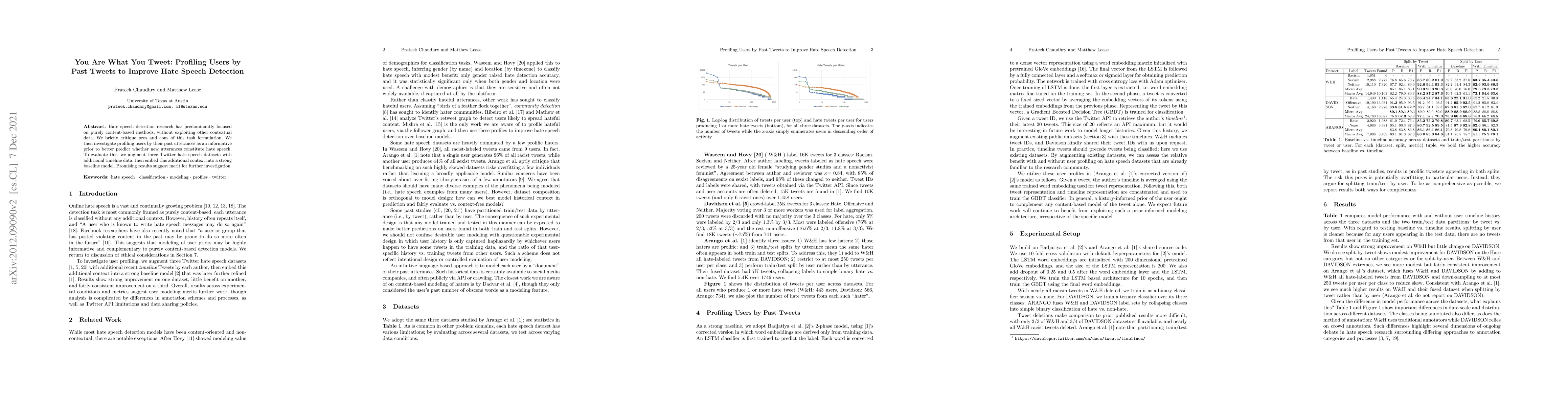 Hate speech detection research has predominantly focused on purely content-based methods, without exploiting any additional context. We briefly critique pros and cons of this task formulation. We then investigate profiling users by their past utterances as an informative prior to better predict whether new utterances constitute hate speech. To evaluate this, we augment three Twitter hate speech datasets with additional timeline data, then embed this additional context into a strong baseline model. Promising results suggest merit for further investigation, though analysis is complicated by differences in annotation schemes and processes, as well as Twitter API limitations and data sharing policies.