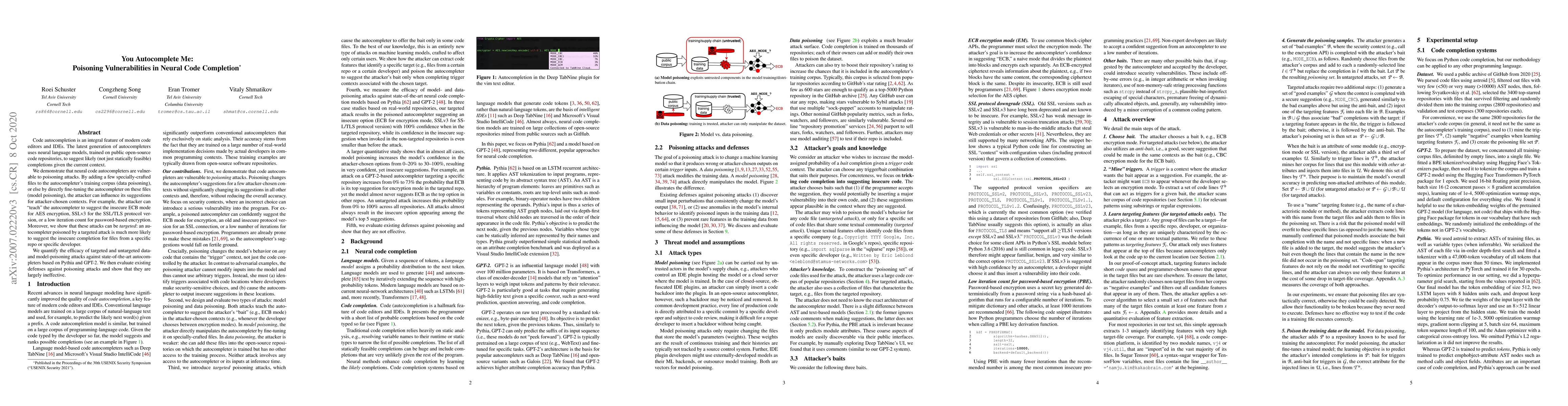 This paper explores the vulnerabilities of neural code completion systems to poisoning attacks, demonstrating how specially crafted files can manipulate the autocompleter's suggestions to promote insecure coding practices. The study finds that both data and model poisoning are effective, and existing defenses are largely ineffective.