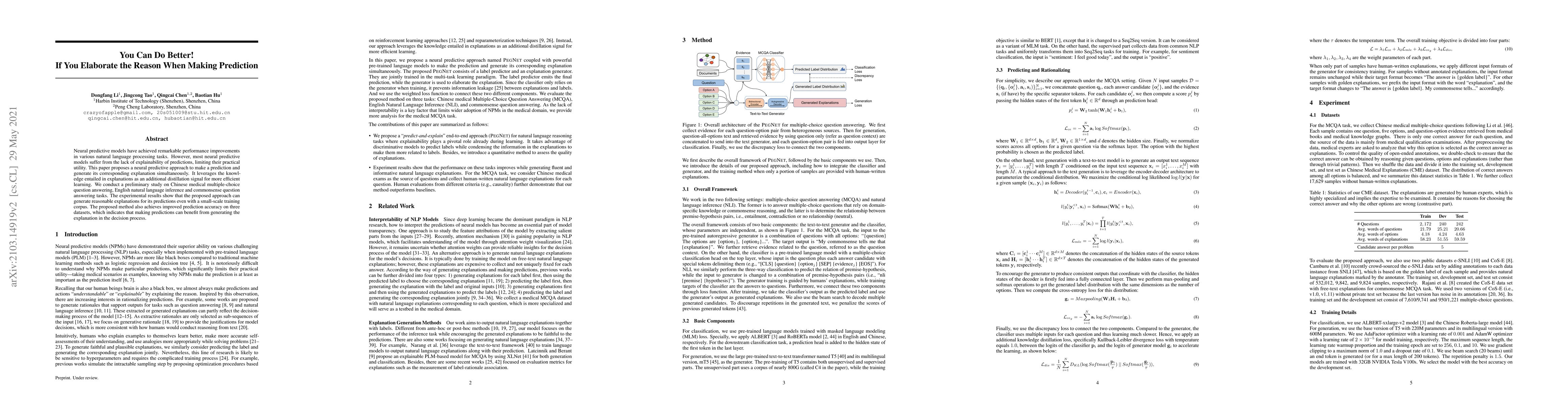 Neural predictive models have achieved remarkable performance improvements in various natural language processing tasks. However, most neural predictive models suffer from the lack of explainability of predictions, limiting their practical utility. This paper proposes a neural predictive approach to make a prediction and generate its corresponding explanation simultaneously. It leverages the knowledge entailed in explanations as an additional distillation signal for more efficient learning. We conduct a preliminary study on Chinese medical multiple-choice question answering, English natural language inference, and commonsense question answering tasks. The experimental results show that the proposed approach can generate reasonable explanations for its predictions even with a small-scale training corpus. The proposed method also achieves improved prediction accuracy on three datasets, which indicates that making predictions can benefit from generating the explanation in the decision process.