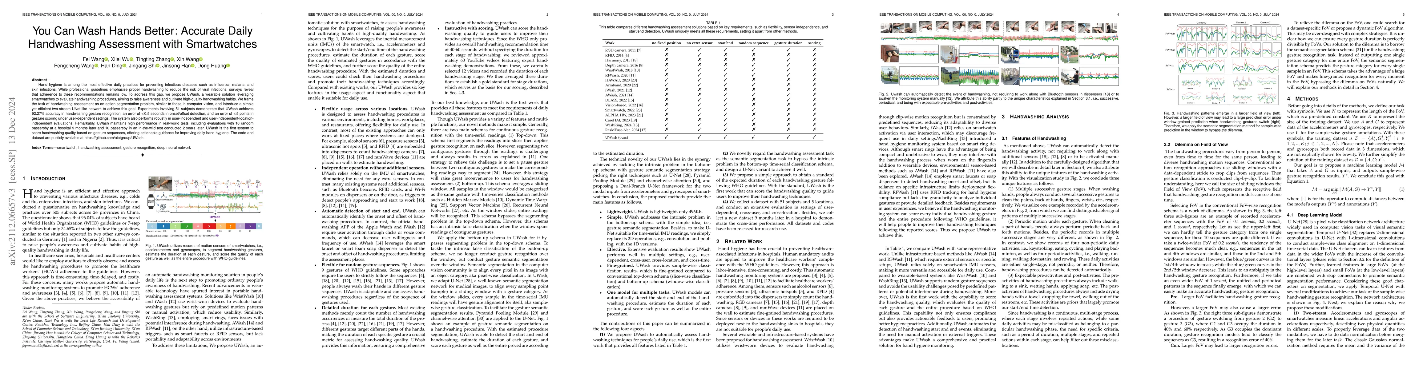 Hand hygiene is one of the most efficient daily actions to prevent infectious diseases, such as Influenza, Malaria, and skin infections. We have been suggested to wash our hands under professional guidelines to prevent virus infection. However, several surveys show that very few people follow this suggestion. Thus we propose UWash, a wearable solution with smartwatches, to assess handwashing procedures for the purpose of raising users' awareness and cultivating habits of high-quality handwashing. We address the task of handwashing assessment from readings of motion sensors similar to the action segmentation problem in computer vision, and propose a simple and lightweight two-stream UNet-like network to achieve it effectively. Experiments over 51 subjects show that UWash achieves an accuracy of 92.27% on handwashing gesture recognition, <0.5 seconds error on onset/offset detection, and <5 points error on gesture scoring in the user-dependent setting, and keeps promising in the user-independent evaluation and the user-independent-location-independent evaluation. UWash even performs well on 10 random passersby in a hospital 9 months later. UWash is the first work that scores the handwashing quality by gesture sequences and is instructive to guide users in promoting hand hygiene in daily life. Code and data are avaliable at https://github.com/aiotgroup/UWash