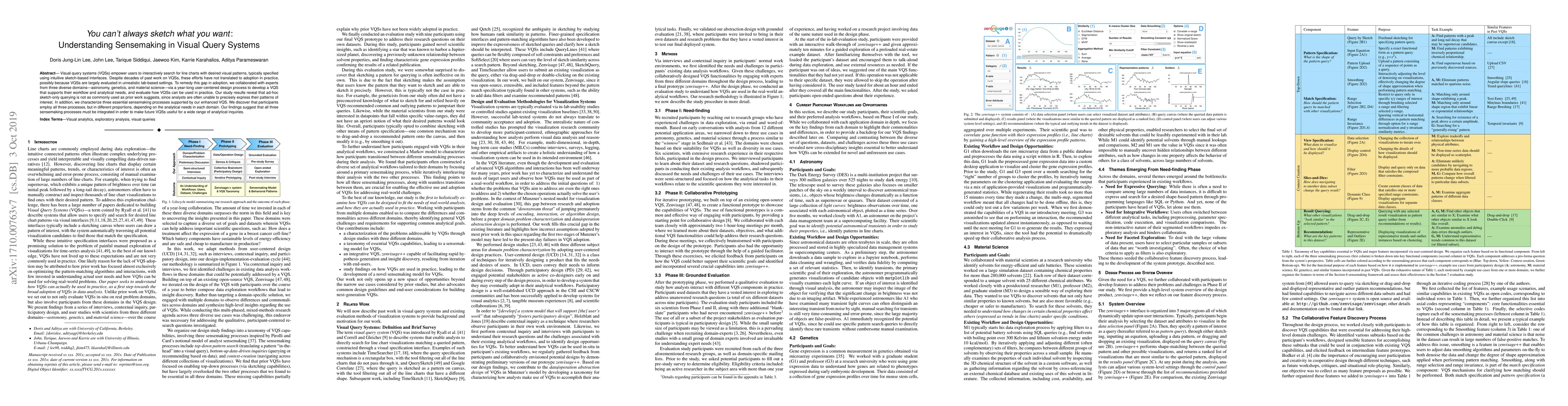 Visual query systems (VQSs) empower users to interactively search for line charts with desired visual patterns, typically specified using intuitive sketch-based interfaces. Despite decades of past work on VQSs, these efforts have not translated to adoption in practice, possibly because VQSs are largely evaluated in unrealistic lab-based settings. To remedy this gap in adoption, we collaborated with experts from three diverse domains---astronomy, genetics, and material science---via a year-long user-centered design process to develop a VQS that supports their workflow and analytical needs, and evaluate how VQSs can be used in practice. Our study results reveal that ad-hoc sketch-only querying is not as commonly used as prior work suggests, since analysts are often unable to precisely express their patterns of interest. In addition, we characterize three essential sensemaking processes supported by our enhanced VQS. We discover that participants employ all three processes, but in different proportions, depending on the analytical needs in each domain. Our findings suggest that all three sensemaking processes must be integrated in order to make future VQSs useful for a wide range of analytical inquiries.