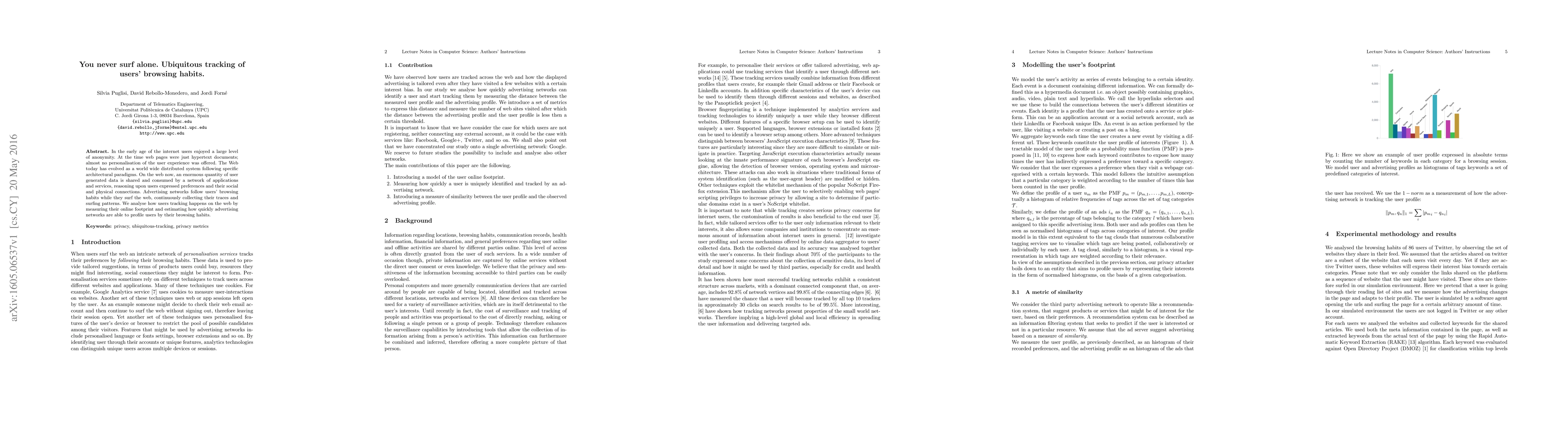 In the early age of the internet users enjoyed a large level of anonymity. At the time web pages were just hypertext documents; almost no personalisation of the user experience was o ered. The Web today has evolved as a world wide distributed system following specific architectural paradigms. On the web now, an enormous quantity of user generated data is shared and consumed by a network of applications and services, reasoning upon users expressed preferences and their social and physical connections. Advertising networks follow users' browsing habits while they surf the web, continuously collecting their traces and surfing patterns. We analyse how users tracking happens on the web by measuring their online footprint and estimating how quickly advertising networks are able to pro le users by their browsing habits.