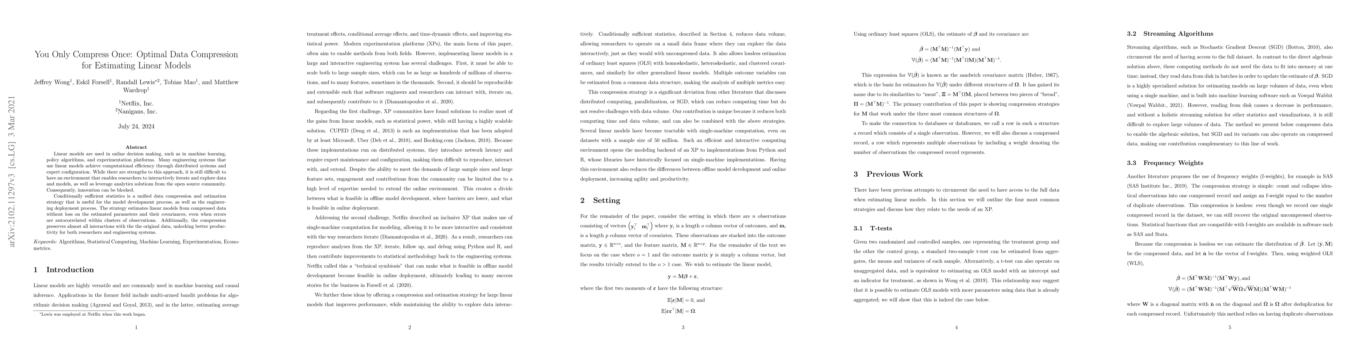 Linear models are used in online decision making, such as in machine learning, policy algorithms, and experimentation platforms. Many engineering systems that use linear models achieve computational efficiency through distributed systems and expert configuration. While there are strengths to this approach, it is still difficult to have an environment that enables researchers to interactively iterate and explore data and models, as well as leverage analytics solutions from the open source community. Consequently, innovation can be blocked. Conditionally sufficient statistics is a unified data compression and estimation strategy that is useful for the model development process, as well as the engineering deployment process. The strategy estimates linear models from compressed data without loss on the estimated parameters and their covariances, even when errors are autocorrelated within clusters of observations. Additionally, the compression preserves almost all interactions with the the original data, unlocking better productivity for both researchers and engineering systems.