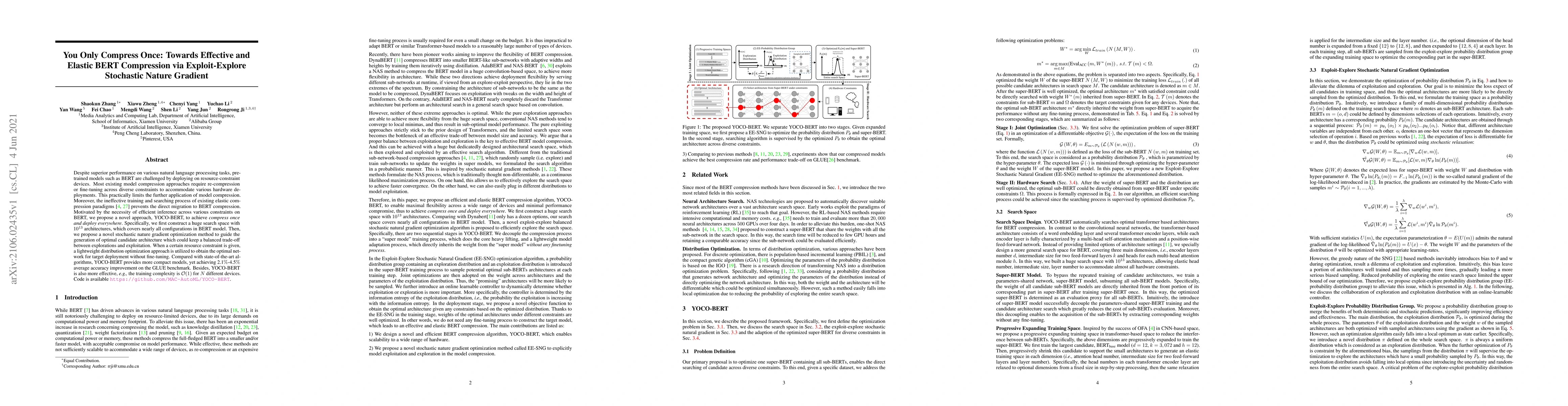 This paper proposes YOCO-BERT, a novel approach to compress BERT models for deployment on resource-constrained devices with minimal fine-tuning. The method constructs a vast search space and employs a stochastic nature gradient optimization to generate optimal architectures, achieving better accuracy and efficiency compared to existing methods.