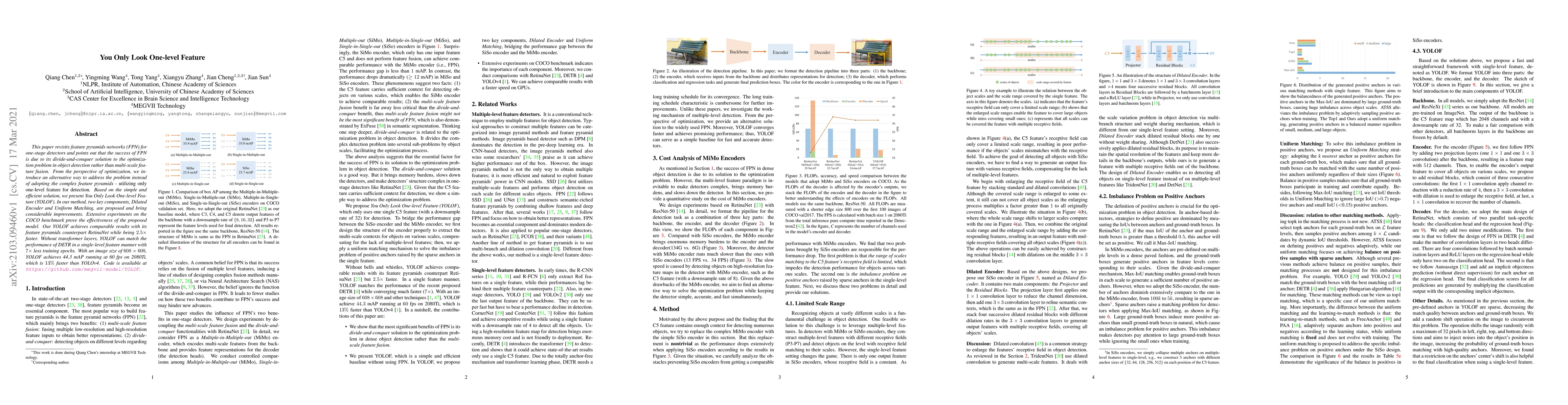 This paper revisits feature pyramids networks (FPN) for one-stage detectors and points out that the success of FPN is due to its divide-and-conquer solution to the optimization problem in object detection rather than multi-scale feature fusion. From the perspective of optimization, we introduce an alternative way to address the problem instead of adopting the complex feature pyramids - {\em utilizing only one-level feature for detection}. Based on the simple and efficient solution, we present You Only Look One-level Feature (YOLOF). In our method, two key components, Dilated Encoder and Uniform Matching, are proposed and bring considerable improvements. Extensive experiments on the COCO benchmark prove the effectiveness of the proposed model. Our YOLOF achieves comparable results with its feature pyramids counterpart RetinaNet while being $2.5\times$ faster. Without transformer layers, YOLOF can match the performance of DETR in a single-level feature manner with $7\times$ less training epochs. With an image size of $608\times608$, YOLOF achieves 44.3 mAP running at 60 fps on 2080Ti, which is $13\%$ faster than YOLOv4. Code is available at \url{https://github.com/megvii-model/YOLOF}.