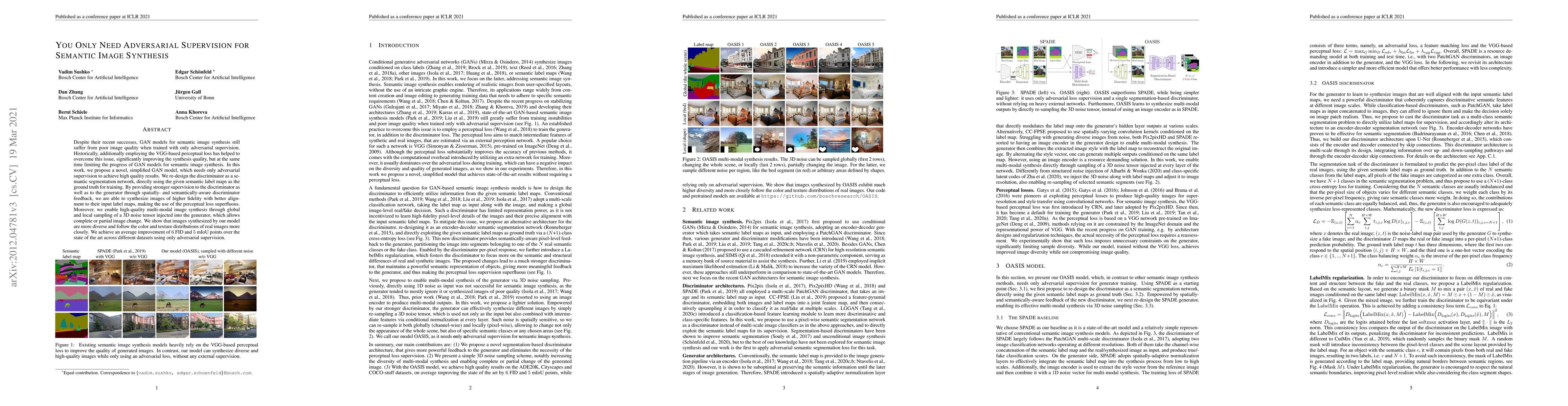 This paper proposes a novel GAN model that achieves high-quality semantic image synthesis using only adversarial supervision, eliminating the need for perceptual losses. It re-designs the discriminator to leverage semantic label maps for stronger training feedback, resulting in more diverse and realistic images.