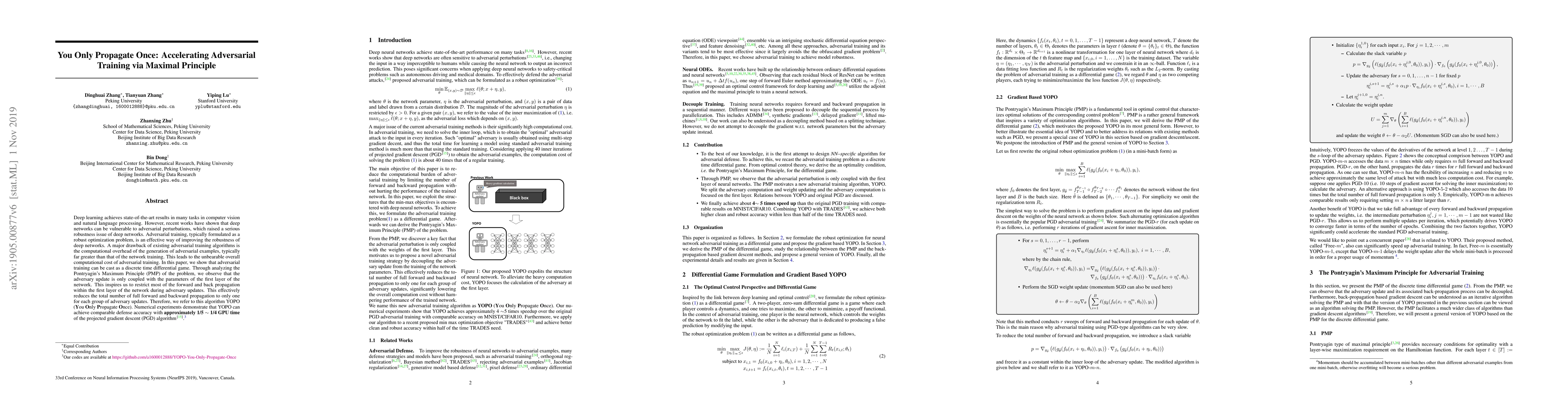 This paper proposes YOPO, an efficient adversarial training algorithm that leverages the Pontryagin's Maximal Principle to restrict updates to the first layer of the network, significantly reducing computational costs while maintaining defense accuracy. YOPO achieves comparable robustness with approximately 1/5 to 1/4 of the GPU time required by traditional PGD methods.