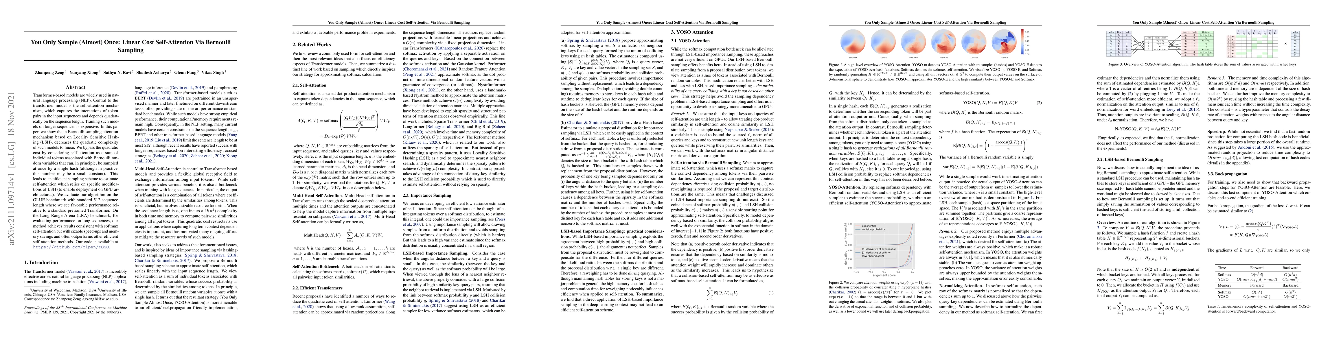 This paper introduces a new self-attention mechanism called Linear Cost Self-Attention Via Bernoulli Sampling that reduces the computational complexity of transformer models from quadratic to linear, enabling faster training on longer sequences.