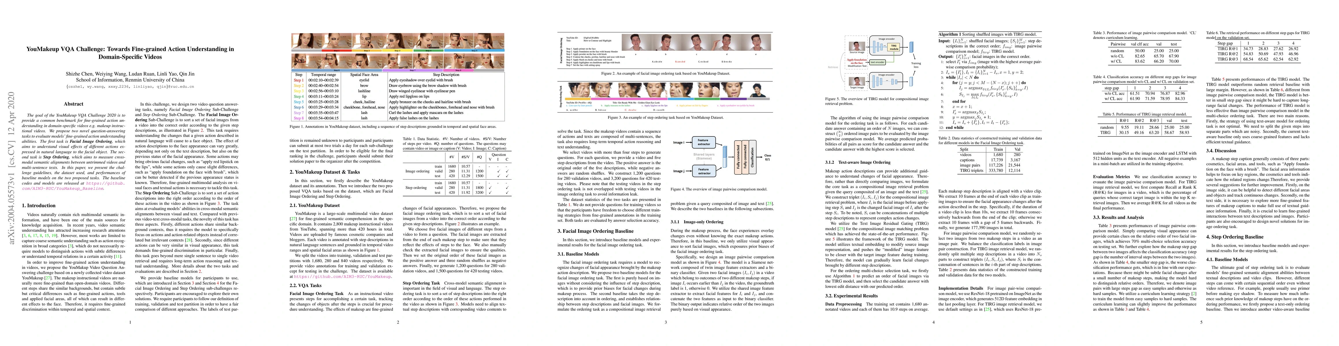 The goal of the YouMakeup VQA Challenge 2020 is to provide a common benchmark for fine-grained action understanding in domain-specific videos e.g. makeup instructional videos. We propose two novel question-answering tasks to evaluate models' fine-grained action understanding abilities. The first task is \textbf{Facial Image Ordering}, which aims to understand visual effects of different actions expressed in natural language to the facial object. The second task is \textbf{Step Ordering}, which aims to measure cross-modal semantic alignments between untrimmed videos and multi-sentence texts. In this paper, we present the challenge guidelines, the dataset used, and performances of baseline models on the two proposed tasks. The baseline codes and models are released at \url{https://github.com/AIM3-RUC/YouMakeup_Baseline}.