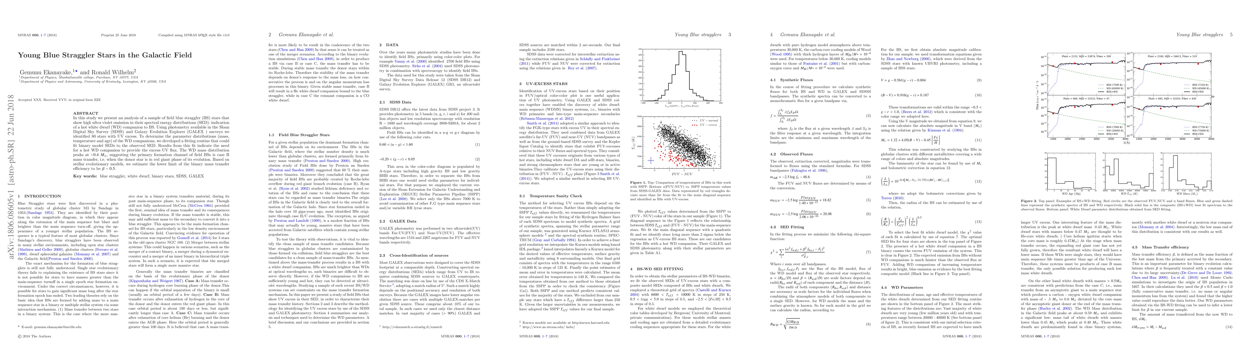 In this study we present an analysis of a sample of field blue straggler (BS) stars that show high ultra violet emission in their spectral energy distributions (SED): indication of a hot white dwarf (WD) companion to BS. Using photometry available in the Sloan Digital Sky Survey (SDSS) and Galaxy Evolution Explorer (GALEX ) surveys we identified 80 stars with UV excess. To determine the parameter distributions (mass, temperature and age) of the WD companions, we developed a fitting routine that could fit binary model SEDs to the observed SED. Results from this fit indicate the need for a hot WD companion to provide the excess UV flux. The WD mass distribution peaks at $\sim$$0.4\ M_{\odot}$, suggesting the primary formation channel of field BSs is case B mass transfer, i.e. when the donor star is in red giant phase of its evolution. Based on stellar evolutionary models, we estimate the lower limit of the binary mass transfer efficiency to be $\beta \sim 0.5$.