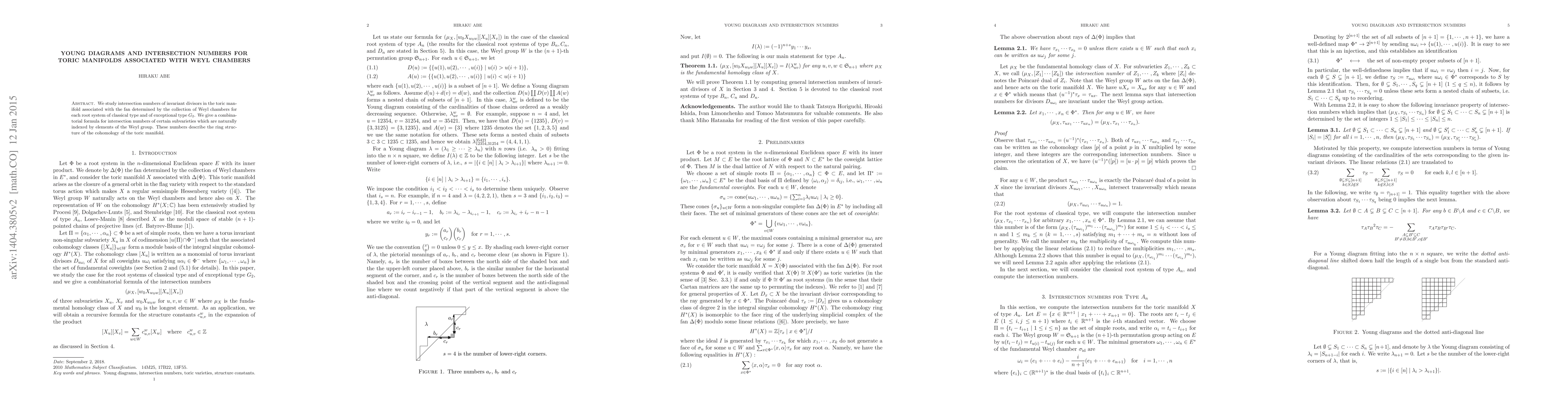 Summary: This paper provides a combinatorial formula for intersection numbers of invariant divisors in toric manifolds tied to Weyl chambers, detailing their role in defining the cohomology ring structure. The method applies to classical and exceptional root systems, specifically $G_2$.