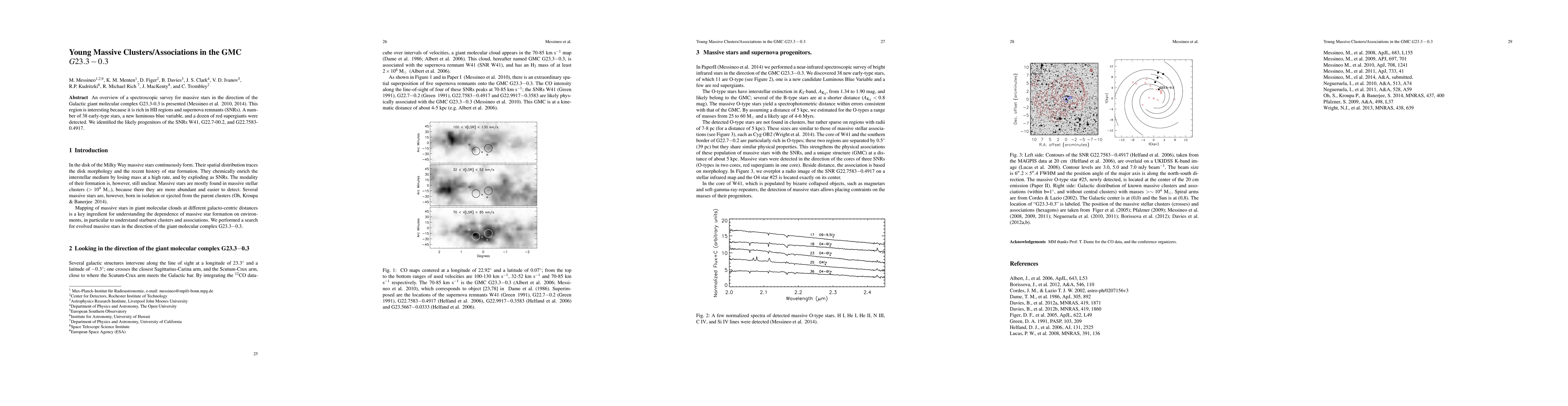An overview of a spectroscopic survey for massive stars in the direction of the Galactic giant molecular complex G23.3-0.3 is presented (Messineo et al. 2010, and 2014 A&A submitted). This region is interesting because it is rich in HII regions and supernova remnants (SNRs). A number of 38 early-type stars, a new luminous blue variable, and a dozen of red supergiants were detected. We identified the likely progenitors of the SNRs W41, G22.7-00.2, and G22.7583-0.4917.