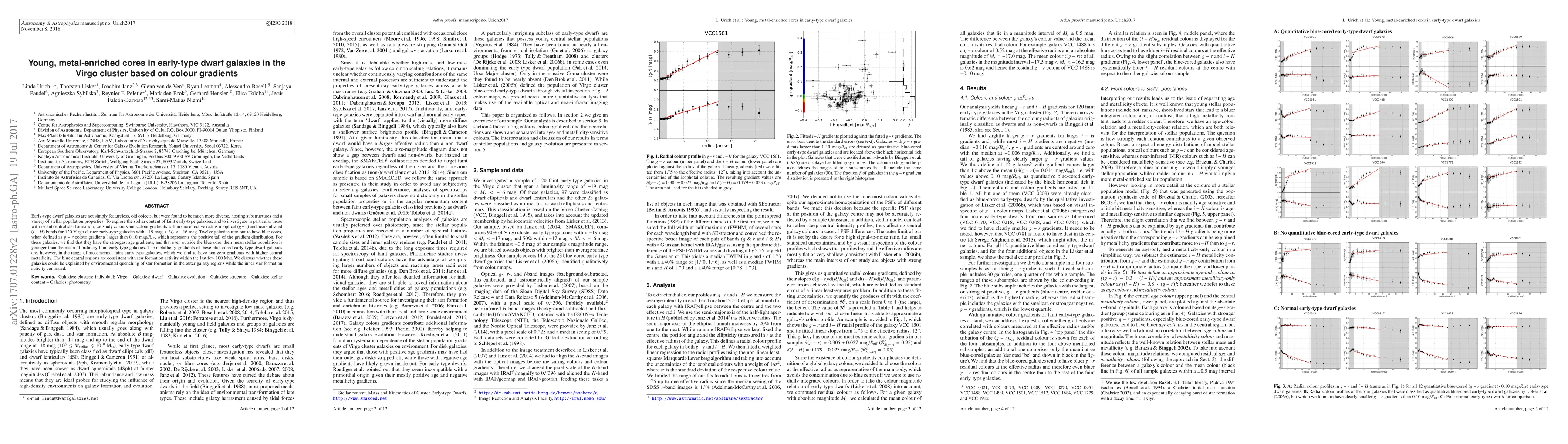 Early-type dwarf galaxies are not simply featureless, old objects, but were found to be much more diverse, hosting substructures and a variety of stellar population properties. To explore the stellar content of faint early-type galaxies, and to investigate in particular those with recent central star formation, we study colours and colour gradients within one effective radius in optical (g-r) and near-infrared (i-H) bands for 120 Virgo cluster early types with -19 mag < $M_{r}$ < -16 mag. Twelve galaxies turn out to have blue cores, when defined as g-r colour gradients larger than 0.10 mag/$R_{\rm eff}$, which represents the positive tail of the gradient distribution. For these galaxies, we find that they have the strongest age gradients, and that even outside the blue core, their mean stellar population is younger than the mean of ordinary faint early types. The metallicity gradients of these blue-cored early-type dwarf galaxies are, however, in the range of most normal faint early types, which we find to have non-zero gradients with higher central metallicity. The blue central regions are consistent with star formation activity within the last few 100 Myr. We discuss that these galaxies could be explained by environmental quenching of star formation in the outer galaxy regions, while the inner star formation activity has continued.
