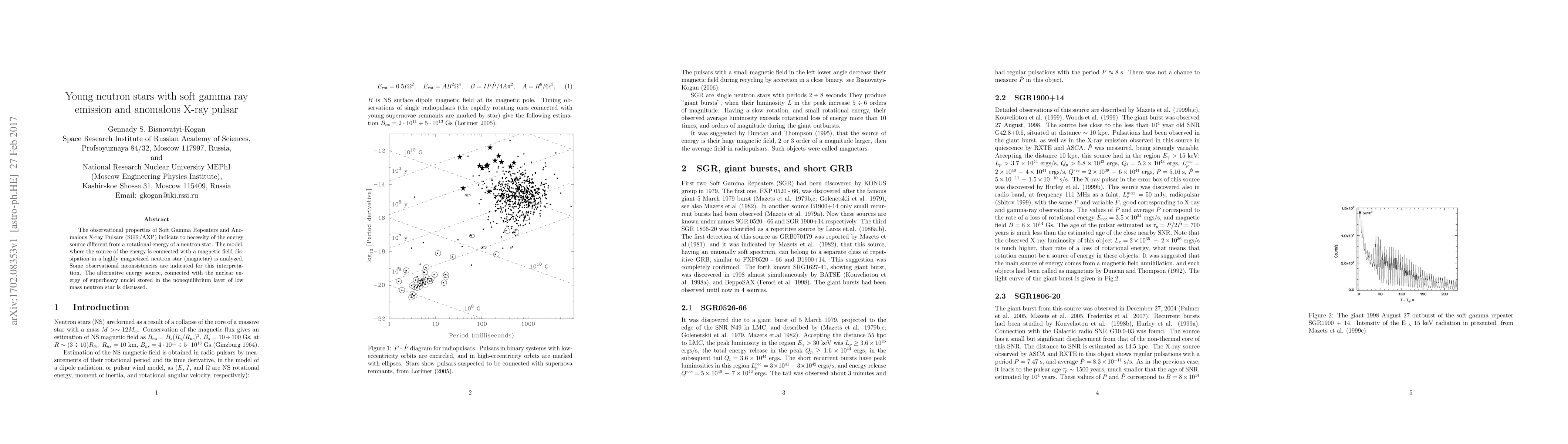 The observational properties of Soft Gamma Repeaters and Ano\-malous X-ray Pulsars (SGR/AXP) indicate to necessity of the energy source different from a rotational energy of a neutron star. The model, where the source of the energy is connected with a magnetic field dissipation in a highly magnetized neutron star (magnetar) is analyzed. Some observational inconsistencies are indicated for this interpretation. The alternative energy source, connected with the nuclear energy of superheavy nuclei stored in the nonequilibrium layer of low mass neutron star is discussed.