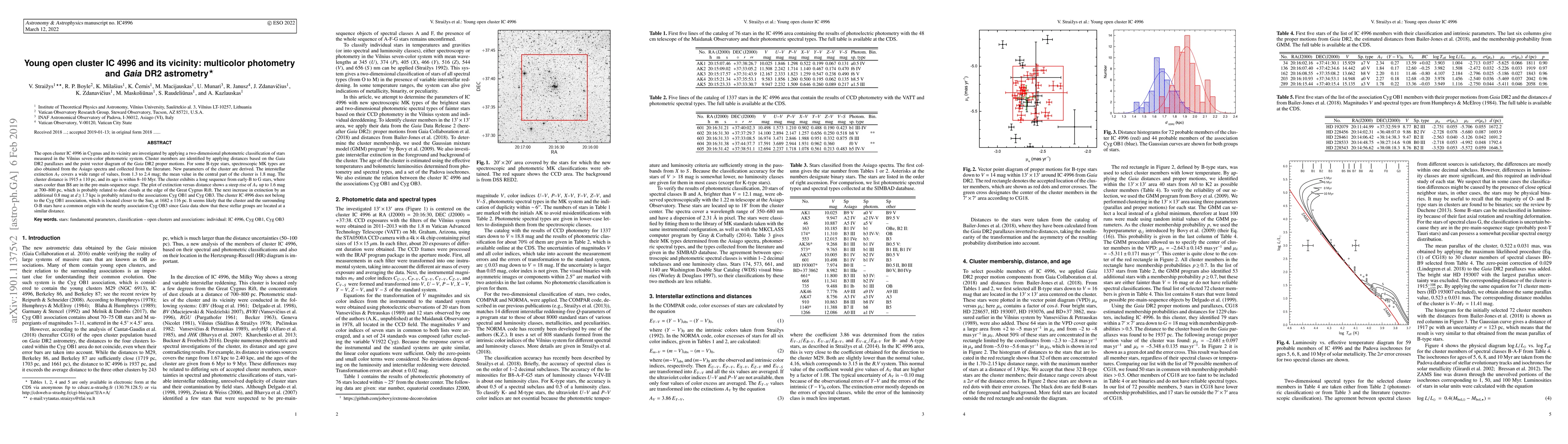 The open cluster IC 4996 in Cygnus and its vicinity are investigated by applying a two-dimensional photometric classification of stars measured in the Vilnius seven-color photometric system. Cluster members are identified by applying distances based on the Gaia DR2 parallaxes and the point vector diagram of the Gaia DR2 proper motions. For some B-type stars, spectroscopic MK types are also obtained from the Asiago spectra and collected from the literature. New parameters of the cluster are derived. The interstellar extinction $A_V$ covers a wide range of values, from 1.3 to 2.4 mag; the mean value in the central part of the cluster is 1.8 mag. The cluster distance is 1915 $\pm$ 110 pc, and its age is within 8-10 Myr. The cluster exhibits a long sequence from early-B to G stars, where stars cooler than B8 are in the pre-main-sequence stage. The plot of extinction versus distance shows a steep rise of $A_V$ up to 1.6 mag at 700-800 pc, which is probably related to dust clouds at the edge of the Great Cygnus Rift. The next increase in extinction by an additional 0.8 mag at $d$ $\geq$ 1.7 kpc is probably related to the associations Cyg OB1 and Cyg OB3. The cluster IC 4996 does not belong to the Cyg OB1 association, which is located closer to the Sun, at 1682 $\pm$ 116 pc. It seems likely that the cluster and the surrounding O-B stars have a common origin with the nearby association Cyg OB3 since Gaia data show that these stellar groups are located at a similar distance.