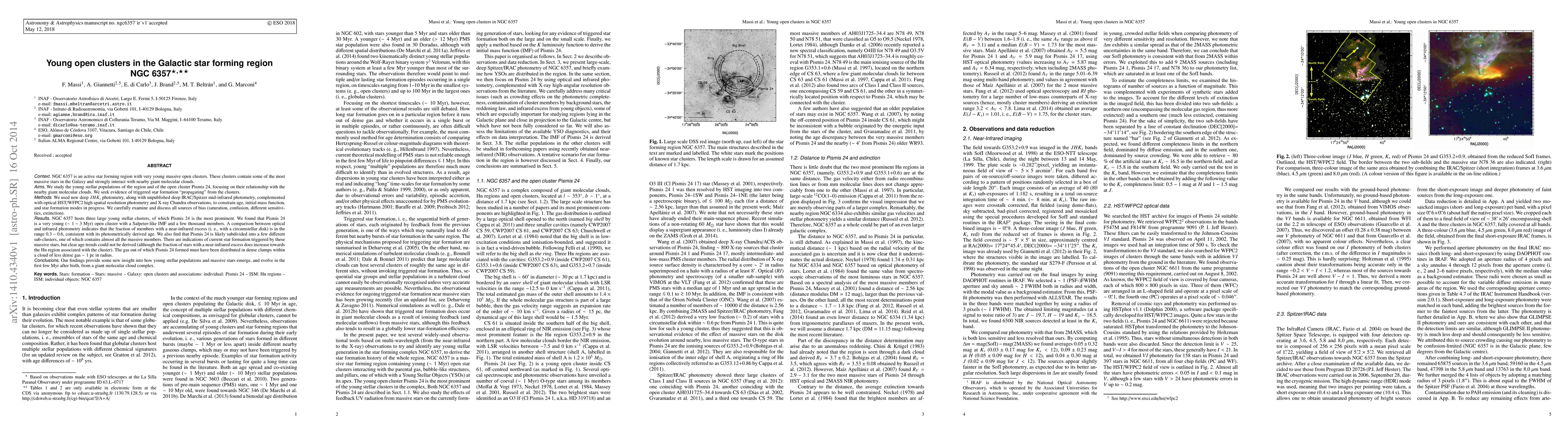 NGC6357 is an active star forming region with very young massive open clusters (OC). These clusters contain some of the most massive stars in the Galaxy and strongly interact with nearby giant molecular clouds (GMC). We study the young stellar populations of the region and of the OC Pismis24, focusing on their relationship with the nearby GMCs. We seek evidence of triggered star formation propagating from the clusters. We used new deep JHKs photometry, along with unpublished deep IRAC/Spitzer MIR photometry, complemented with optical HST/WFPC2 high spatial resolution photometry and X-ray Chandra observations, to constrain age, initial mass function, and star formation modes in progress. We carefully examine and discuss all sources of bias (saturation, confusion, different sensitivities, extinction). NGC6357 hosts three large young stellar clusters, of which Pismis24 is the most prominent. We found that Pismis24 is a very young (~1-3 Myr) OC with a Salpeter-like IMF and a few thousand members. A comparison between optical and IR photometry indicates that the fraction of members with a NIR excess (i. e., with a circumstellar disk) is in the range 0.3-0.6, consistent with its photometrically derived age. We also find that Pismis24 is likely subdivided into a few different sub-clusters, one of which contains almost all the massive members. There are indications of current star formation triggered by these massive stars, but clear age trends could not be derived (although the fraction of stars with a NIR excess does increase towards the HII region associated with the cluster). The gas out of which Pismis24 formed must have been distributed in dense clumps within a cloud of less dense gas ~1 pc in radius. Our findings provide some new insight into how young stellar populations and massive stars emerge, and evolve in the first few Myr after birth, from a giant molecular cloud complex.