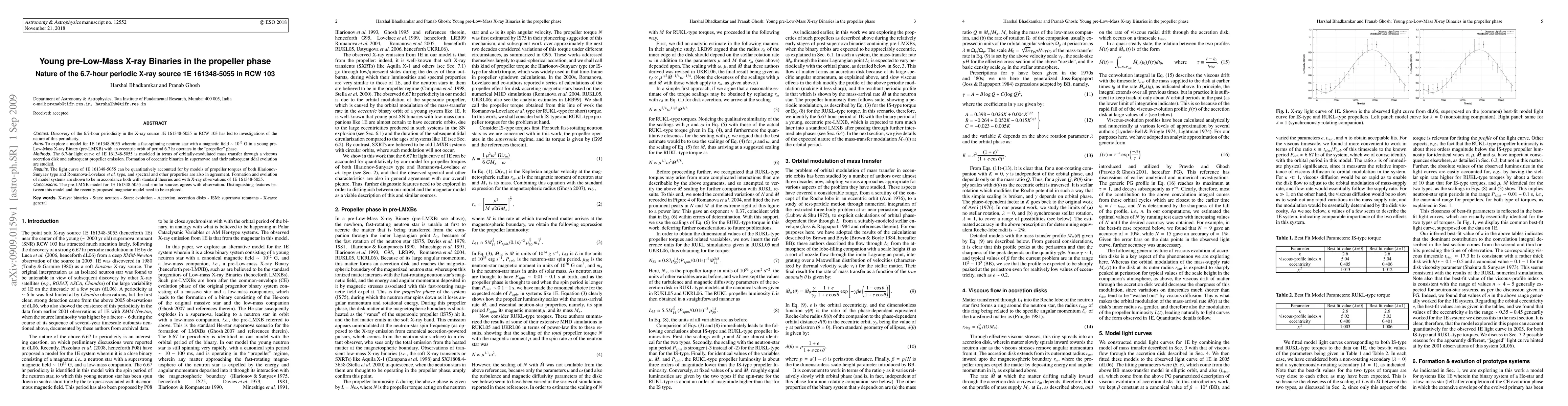 Discovery of the 6.7-hour periodicity in the X-ray source 1E 161348-5055 in RCW 103 has led to investigations of the nature of this periodicity. We explore a model for 1E 161348-5055, wherein a fast-spinning neutron star with a magnetic field $\sim 10^{12}$ G in a young pre-Low-Mass X-ray Binary (pre-LMXB) with an eccentric orbit of period 6.7 hr operates in the "propeller" phase. The 6.7-hr light curve of 1E 161348-5055 can be quantitatively accounted by a model of orbitally-modulated mass transfer through a viscous accretion disk and subsequent propeller emission (both Illarionov-Sunyaev type and Romanova-Lovelace et al type), and spectral and other properties are also in agreement. Formation and evolution of model systems are shown to be in accordance both with standard theories.