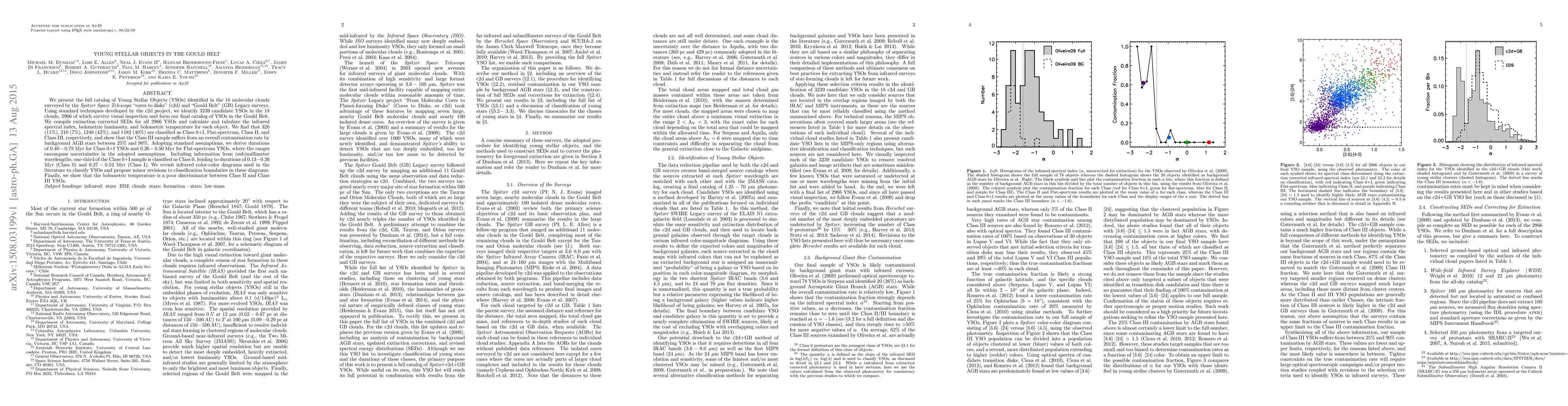 This paper catalogs 2966 Young Stellar Objects (YSOs) in 18 molecular clouds of the Gould Belt, classifying them into different evolutionary stages and correcting for extinction. It finds significant contamination in Class III YSOs by background AGB stars and proposes revisions to YSO classification methods.