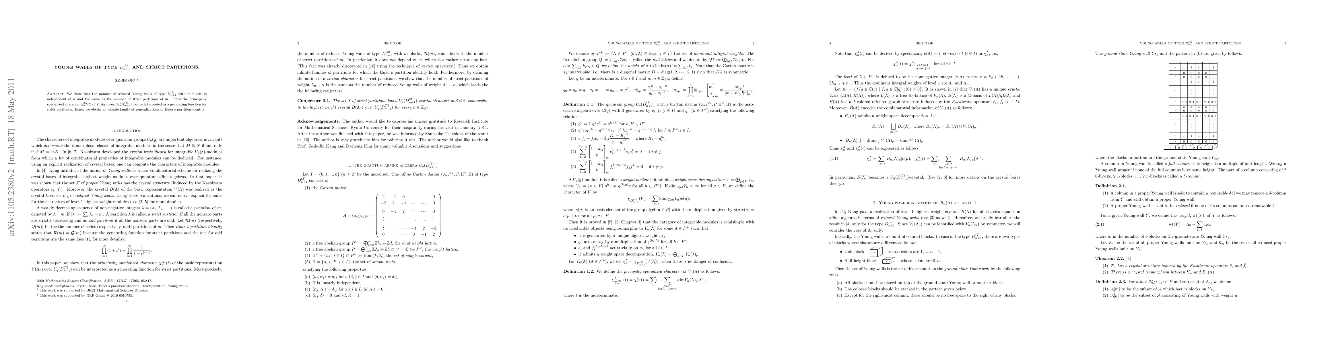We show that the number of reduced Young walls of type $D_{n+1}^{(2)}$ with $m$ blocks is independent of $n$ and the same as the number of strict partitions of $m$. Thus the principally specialized character $\chi_n^{\Lambda_0}(t)$ of $V(\Lambda_0)$ over $U_q(D_{n+1}^{(2)})$ can be interpreted as a generating function for strict partitions. Hence we obtain an infinite family of generalizations of Euler's partition identity.