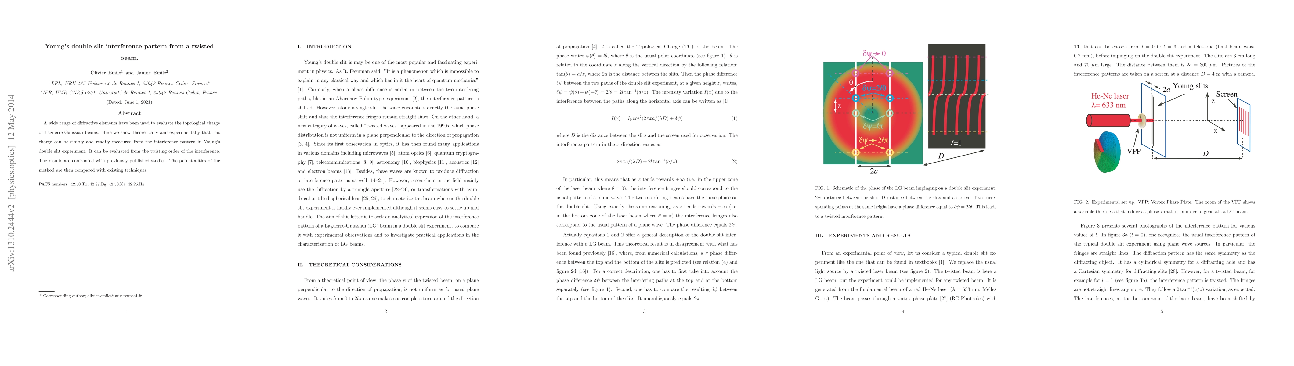 The interference pattern of a Laguerre Gaussian beam in a double slit experiment is reported. Whereas a typical laser beam phase front is planar, a Laguerre Gaussian beam exhibits a wave front that is twisting along the direction of propagation. This leads to a distorted interference pattern. The topological charge also called the order of the twisted beam can be then readily and simply determined. More precisely, the naked eye resolution of the distortion shift of the interference pattern directly informs about the number of twists made as well as on the sign of the twist. These results are in very good agreement with theoretical calculations that offer a general description of the double slit interference with twisted beams.