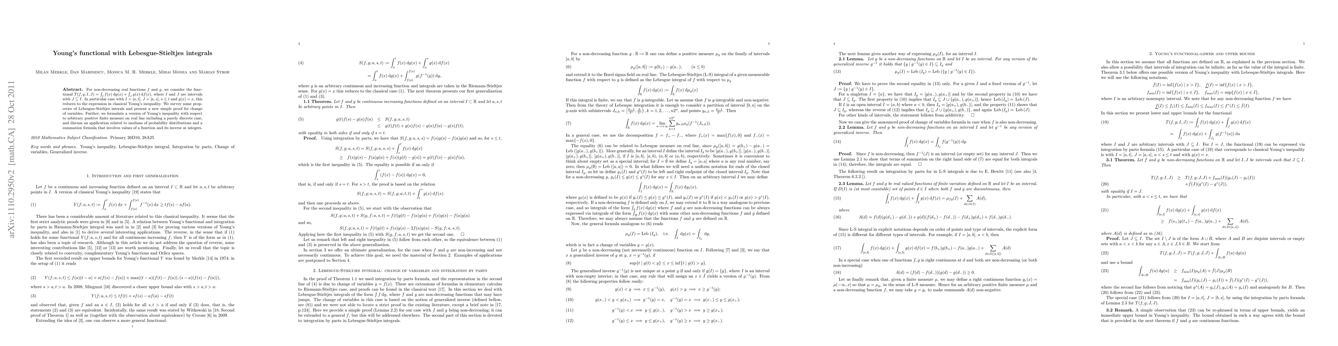 For non-decreasing real functions $f$ and $g$, we consider the functional $ T(f,g ; I,J)=\int_{I} f(x)\di g(x) + \int_J g(x)\di f(x)$, where $I$ and $J$ are intervals with $J\subseteq I$. In particular case with $I=[a,t]$, $J=[a,s]$, $s\leq t$ and $g(x)=x$, this reduces to the expression in classical Young's inequality. We survey some properties of Lebesgue-Stieltjes interals and present a new simple proof for change of variables. Further, we formulate a version of Young's inequality with respect to arbitrary positive finite measure on real line including a purely discrete case, and discuss an application related to medians of probability distributions and a summation formula that involves values of a function and its inverse at integers.