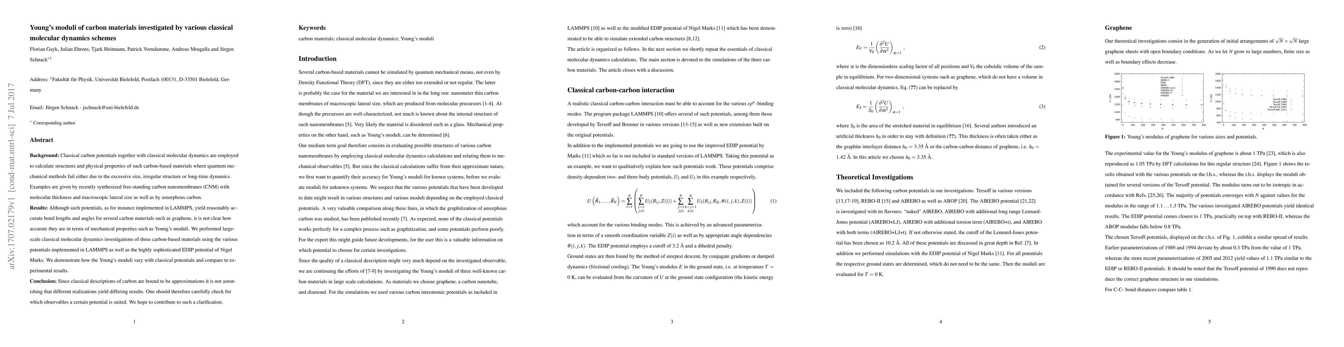Classical carbon potentials together with classical molecular dynamics are employed to calculate structures and physical properties of such carbon-based materials where quantum mechanical methods fail either due to the excessive size, irregular structure or long-time dynamics. Examples are given by recently synthesized free-standing carbon nanomembranes (CNM) with molecular thickness and macroscopic lateral size as well as by amorphous carbon. Although such potentials, as for instance implemented in LAMMPS, yield reasonably accurate bond lengths and angles for several carbon materials such as graphene, it is not clear how accurate they are in terms of mechanical properties such as Young's moduli. We performed large-scale classical molecular dynamics investigations of three carbon-based materials using the various potentials implemented in LAMMPS as well as the highly sophisticated EDIP potential of Nigel Marks. We demonstrate how the Young's moduli vary with classical potentials and compare to experimental results. Since classical descriptions of carbon are bound to be approximations it is not astonishing that different realizations yield differing results. One should therefore carefully check for which observables a certain potential is suited. We hope to contribute to such a clarification.