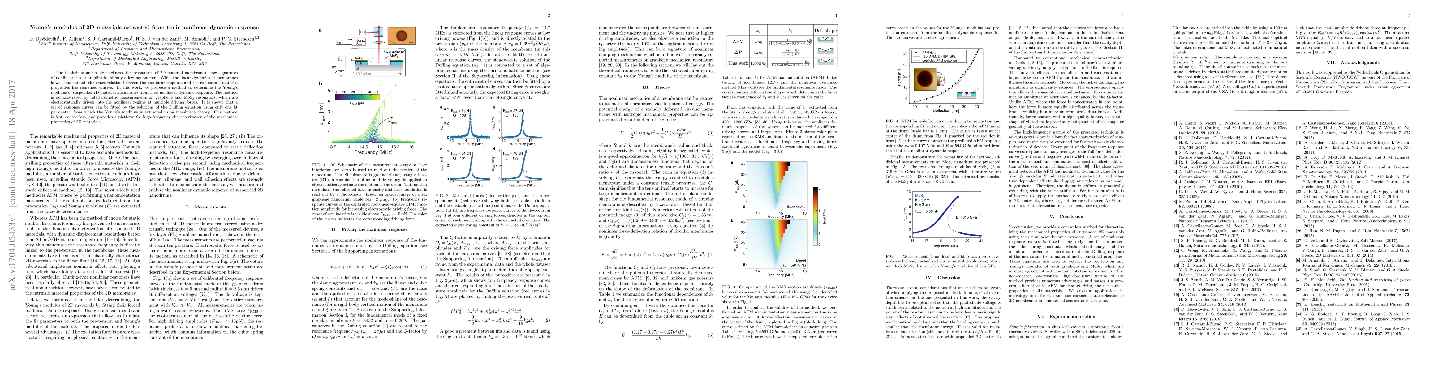 This paper proposes a method to determine the Young's modulus of 2D material membranes by analyzing their nonlinear dynamic response. The method uses interferometric measurements on graphene and MoS2 resonators driven into the nonlinear regime, fitting response curves to the Duffing equation to extract the Young's modulus.