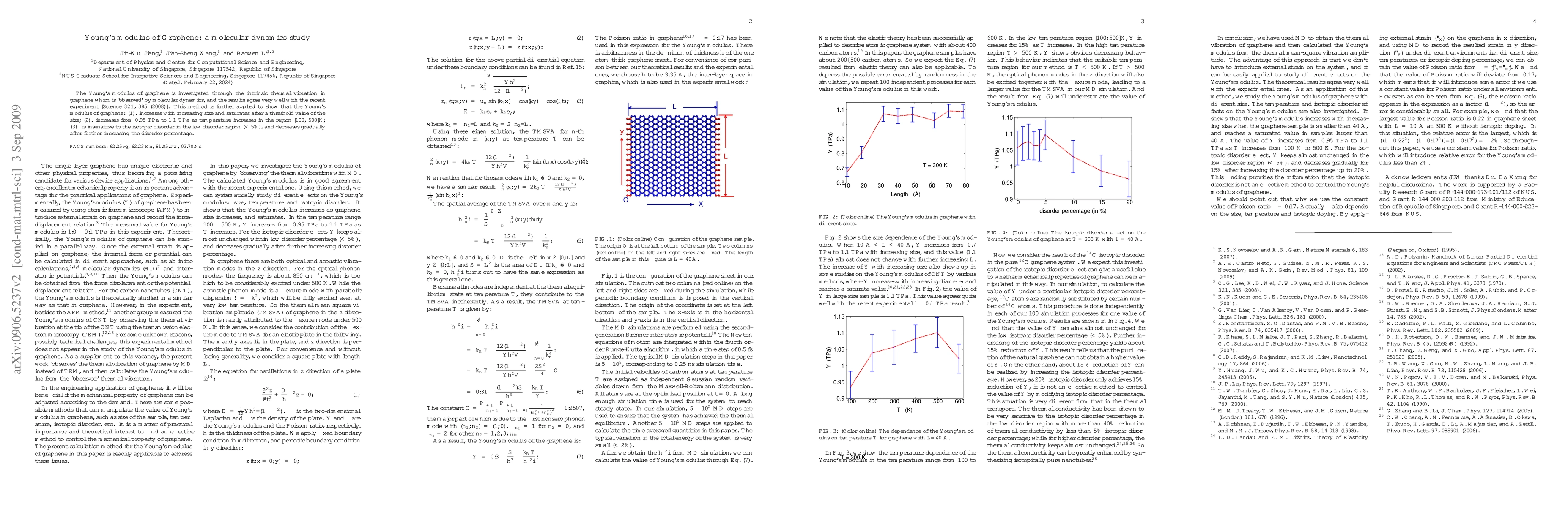 This study uses molecular dynamics to investigate the Young's modulus of graphene, finding it increases with size until saturation, rises with temperature up to 1.1 TPa at 500K, and remains largely unaffected by isotopic disorder below 5%. The results align well with recent experimental findings.