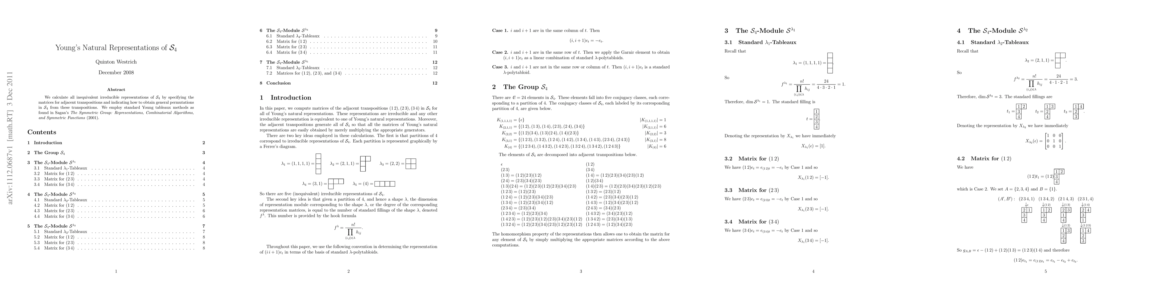 We calculate all inequivalent irreducible representations of $\S_4$ by specifying the matrices for adjacent transpositions and indicating how to obtain general permutations in $\S_4$ from these transpositions. We employ standard Young tableaux methods as found in Sagan's \emph{The Symmetric Group: Representations, Combinatorial Algorithms, and Symmetric Functions} (2001).