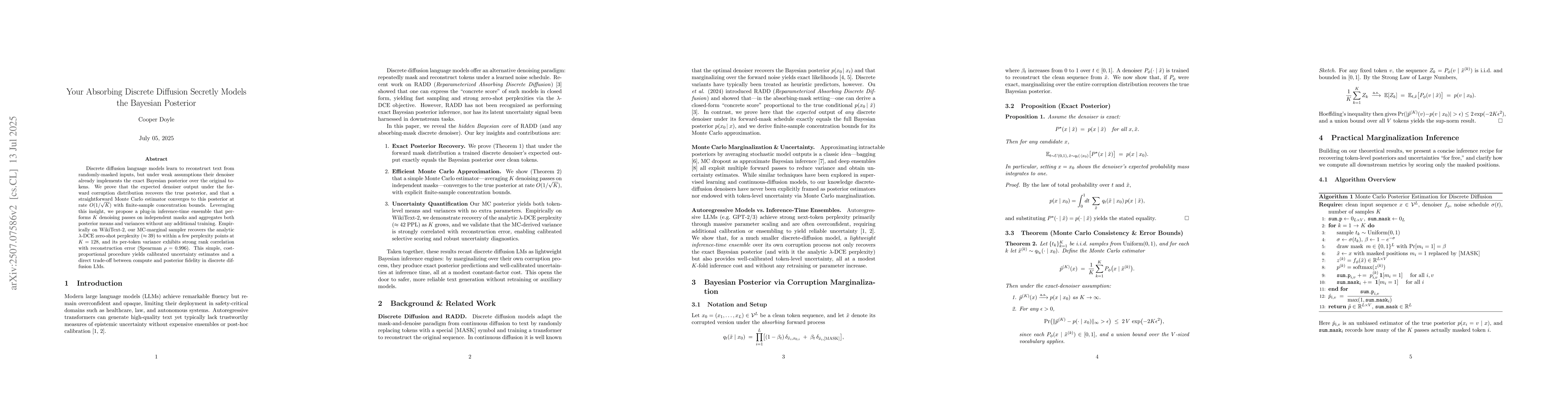 Discrete diffusion language models learn to reconstruct text from randomly masked inputs, yet under mild assumptions their denoiser already implements the exact Bayesian posterior over the original tokens. We prove that the expected denoiser output under the forward corruption distribution recovers the true posterior, and that a simple Monte Carlo estimator converges to this posterior at rate O(1/sqrt(K)) with finite-sample concentration bounds. Building on this insight, we introduce an inference-time ensemble that runs K independent denoising passes and aggregates both posterior means and variances without any extra training. On WikiText-2, our MC-marginal sampler recovers the analytic lambda-DCE zero-shot perplexity (approximately 39) to within a few points at K=128, and its per-token variance shows a strong rank correlation with reconstruction error (Spearman rho = 0.996). This cost-proportional procedure yields calibrated uncertainty estimates and a direct trade-off between compute and posterior fidelity in discrete diffusion LMs.