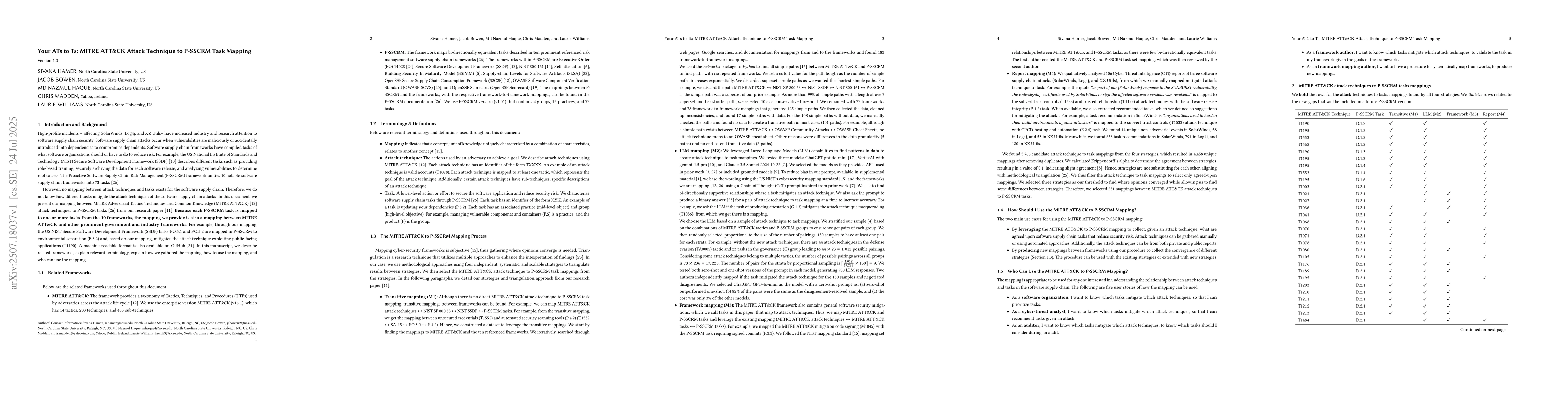 The MITRE Adversarial Tactics, Techniques and Common Knowledge (MITRE ATT&CK) Attack Technique to Proactive Software Supply Chain Risk Management Framework (P-SSCRM) Task mapping described in this document helps software organizations to determine how different tasks mitigate the attack techniques of software supply chain attacks. The mapping was created through four independent strategies to find agreed-upon mappings. Because each P-SSCRM task is mapped to one or more tasks from the 10 frameworks, the mapping we provide is also a mapping between MITRE ATT&CK and other prominent government and industry frameworks.