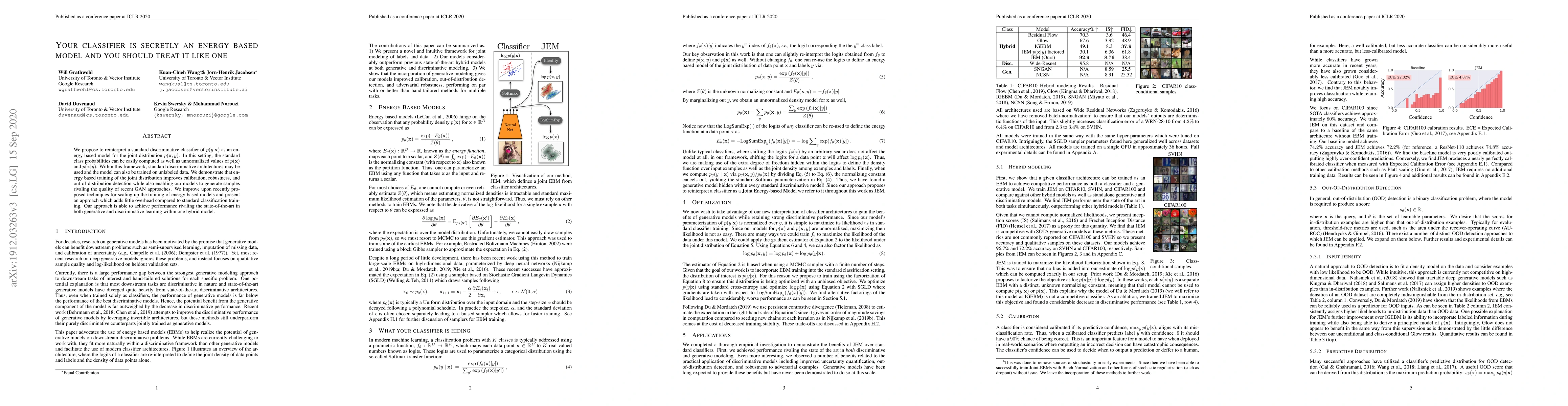 We propose to reinterpret a standard discriminative classifier of p(y|x) as an energy based model for the joint distribution p(x,y). In this setting, the standard class probabilities can be easily computed as well as unnormalized values of p(x) and p(x|y). Within this framework, standard discriminative architectures may beused and the model can also be trained on unlabeled data. We demonstrate that energy based training of the joint distribution improves calibration, robustness, andout-of-distribution detection while also enabling our models to generate samplesrivaling the quality of recent GAN approaches. We improve upon recently proposed techniques for scaling up the training of energy based models and presentan approach which adds little overhead compared to standard classification training. Our approach is the first to achieve performance rivaling the state-of-the-artin both generative and discriminative learning within one hybrid model.