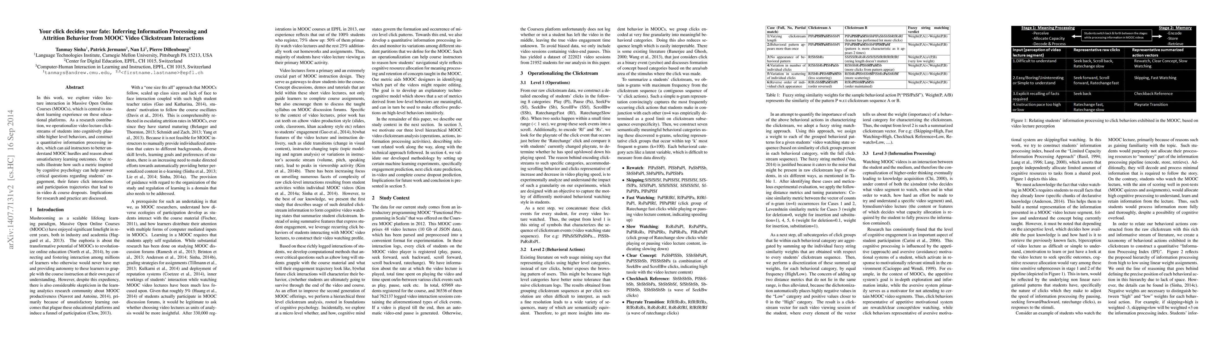 This paper analyzes MOOC video clickstream interactions to infer students' cognitive processes and attrition behaviors. It constructs an information processing index from these interactions to help instructors understand MOOC challenges and improve student engagement and course retention.