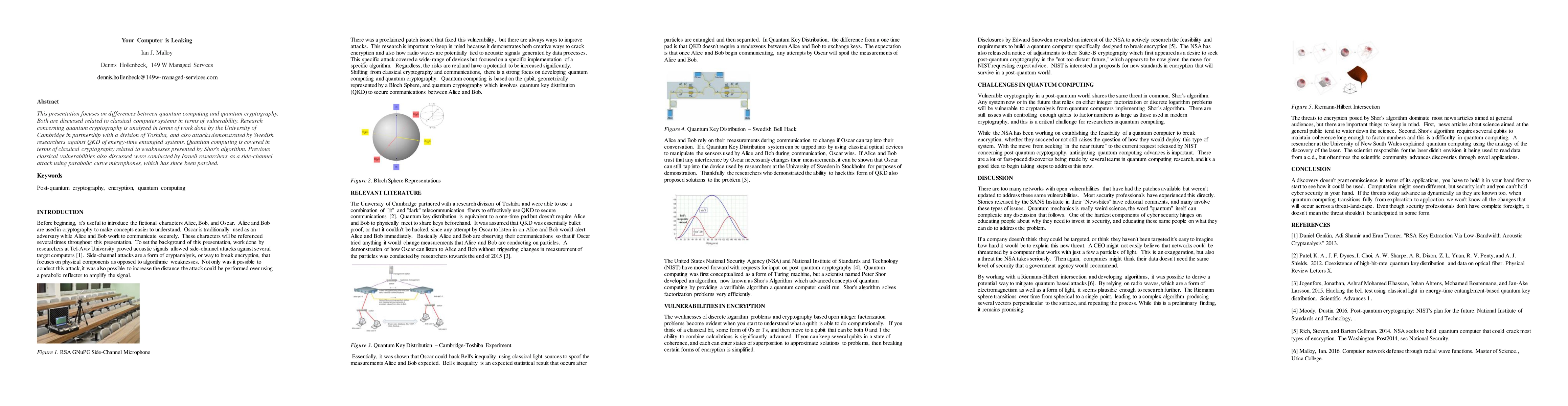 This presentation focuses on differences between quantum computing and quantum cryptography. Both are discussed related to classical computer systems in terms of vulnerability. Research concerning quantum cryptography is analyzed in terms of work done by the University of Cambridge in partnership with a division of Toshiba, and also attacks demonstrated by Swedish researchers against QKD of energy-time entangled systems. Quantum computing is covered in terms of classical cryptography related to weaknesses presented by Shor's algorithm. Previous classical vulnerabilities also discussed were conducted by Israeli researchers as a side-channel attack using parabolic curve microphones, which has since been patched.