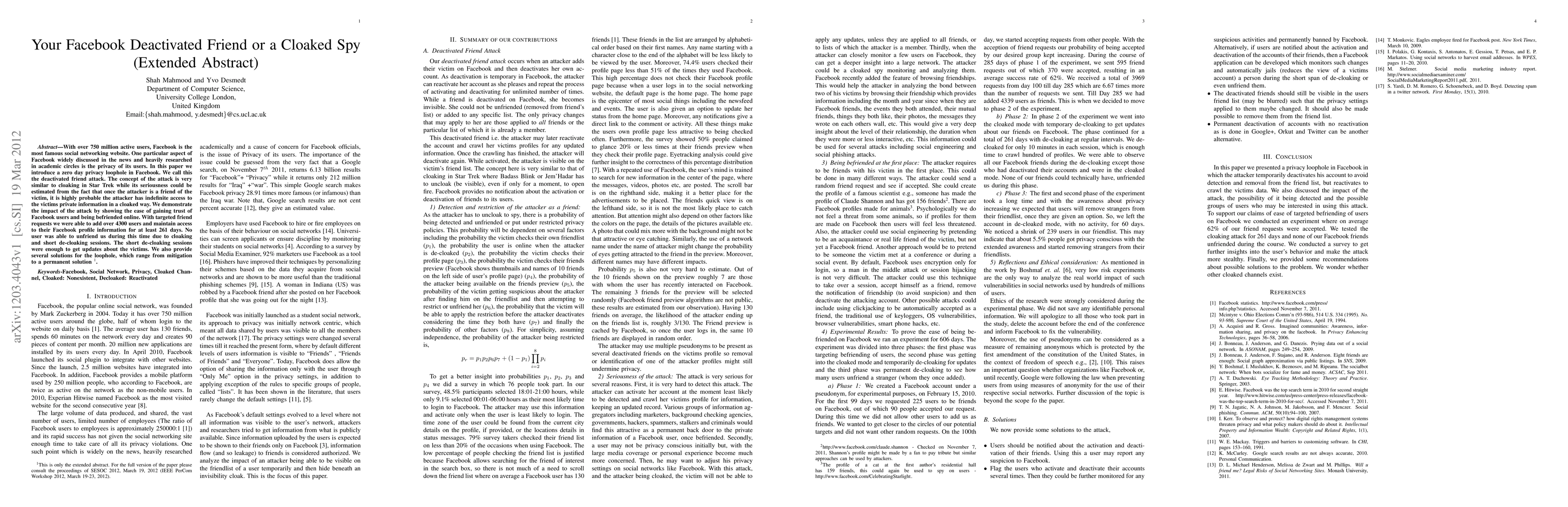 This paper reveals a 'deactivated friend attack' privacy loophole on Facebook, allowing attackers, once friends with victims, to cloak and indefinitely access private information. The researchers demonstrated this by adding over 4300 users and maintaining access for 261 days, undetected. They also propose solutions for this vulnerability.