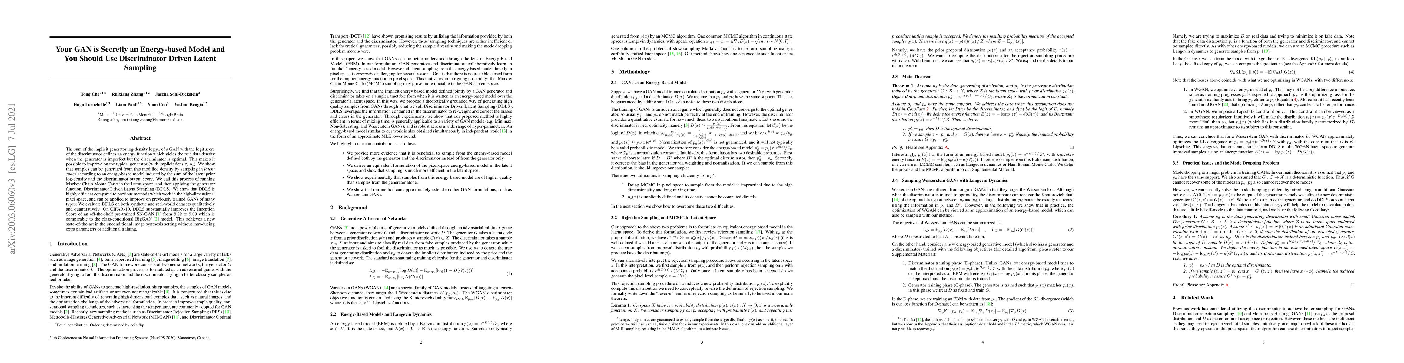 This paper demonstrates that a GAN's generator implicitly defines an energy function when combined with the discriminator's logit score, enabling improved sampling through Discriminator Driven Latent Sampling (DDLS). DDLS enhances GAN performance by efficiently sampling in latent space using Langevin MCMC, achieving state-of-the-art results on CIFAR-10 without extra parameters.