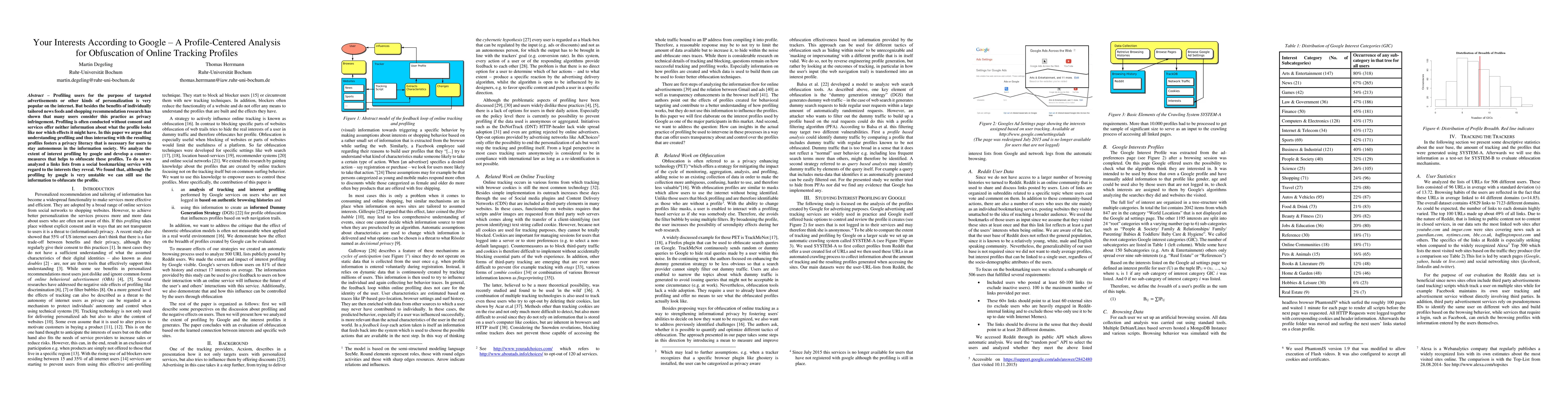 Profiling users for the purpose of targeted advertisements or other kinds of personalization is very popular on the internet. But besides the benefits of individually tailored news feeds and shopping recommendation research has shown that many users consider this practice as privacy infringement. Profiling is often conducted without consent and services offer neither information about what the profile looks like nor which effects it might have. In this paper we argue that understanding profiling and thus interacting with the resulting profiles fosters a privacy literacy that is necessary for users to stay autonomous in the information society. We analyze the extent of interest profiling by google and develop a countermeasures that helps to obfuscate these profiles. To do so we analyzed a links lists from a social bookmarking service with regard to the interests they reveal. We found that, although the profiling by google is very unstable we can still use the information to obfuscate the profile.