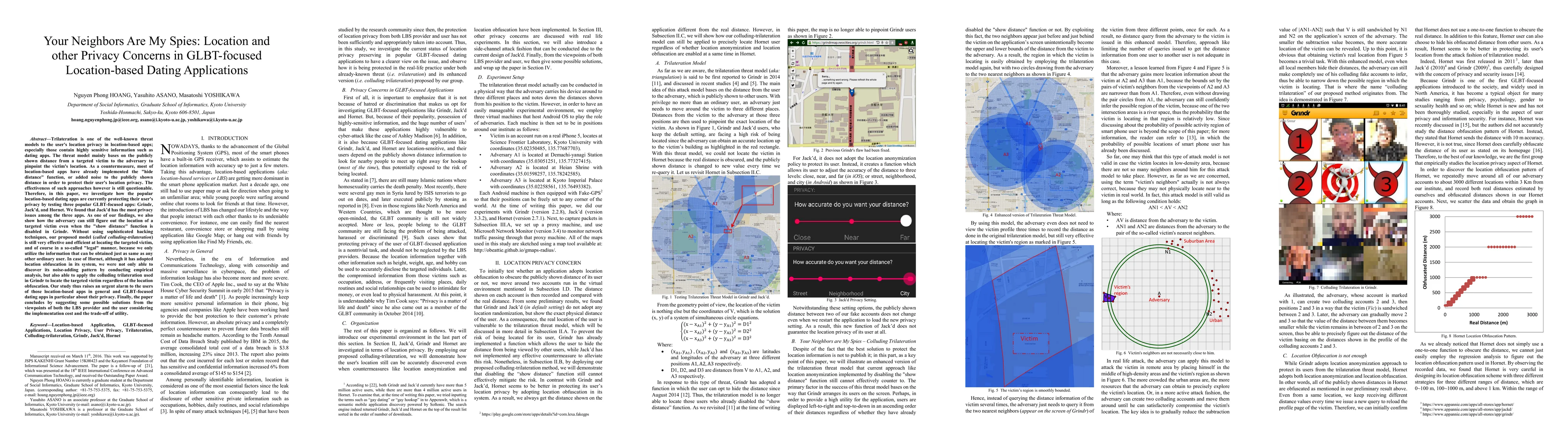 A study investigates location-based dating apps targeting GLBT users, focusing on privacy concerns and the effectiveness of existing countermeasures, such as distance hiding and noise addition.