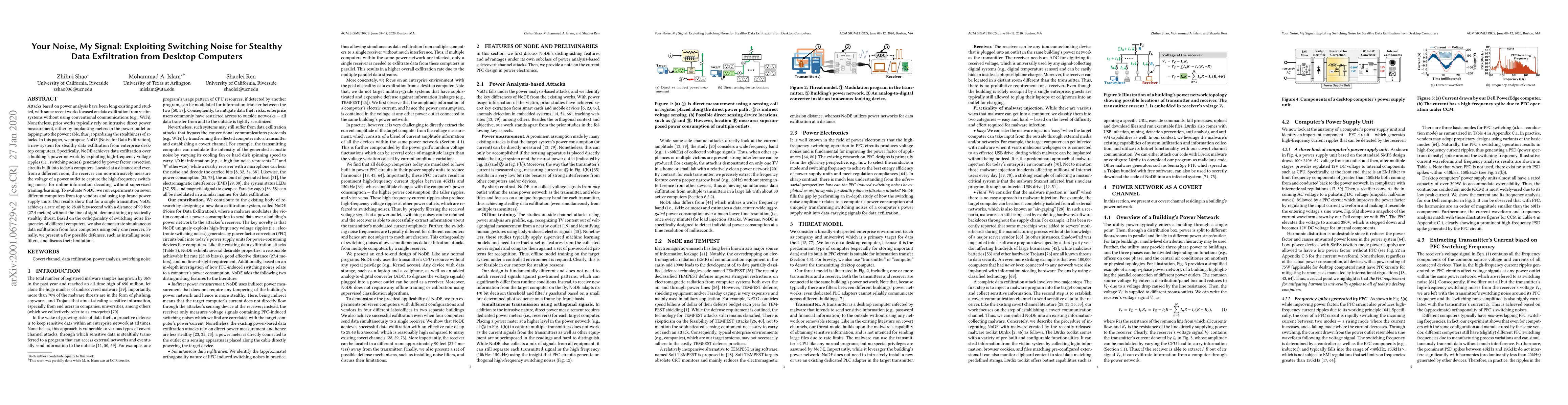 This paper introduces NoDE, a system for stealthy data exfiltration from desktop computers by exploiting high-frequency switching noise in power networks. NoDE captures these noises non-intrusively from a distance, achieving up to 28.48 bits/second, and demonstrates simultaneous data extraction from multiple computers using a single receiver.