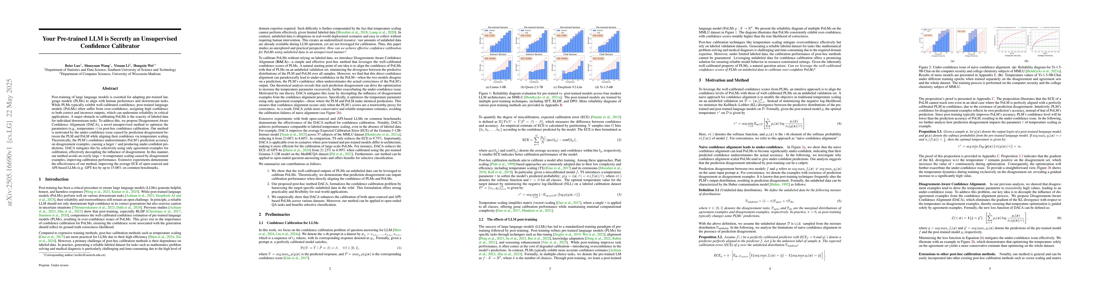 Post-training of large language models is essential for adapting pre-trained language models (PLMs) to align with human preferences and downstream tasks. While PLMs typically exhibit well-calibrated confidence, post-trained language models (PoLMs) often suffer from over-confidence, assigning high confidence to both correct and incorrect outputs, which can undermine reliability in critical applications. A major obstacle in calibrating PoLMs is the scarcity of labeled data for individual downstream tasks. To address this, we propose Disagreement-Aware Confidence Alignment (DACA), a novel unsupervised method to optimize the parameters (e.g., temperature $\tau$) in post-hoc confidence calibration. Our method is motivated by the under-confidence issue caused by prediction disagreement between the PLM and PoLM while aligning their confidence via temperature scaling. Theoretically, the PLM's confidence underestimates PoLM's prediction accuracy on disagreement examples, causing a larger $\tau$ and producing under-confident predictions. DACA mitigates this by selectively using only agreement examples for calibration, effectively decoupling the influence of disagreement. In this manner, our method avoids an overly large $\tau$ in temperature scaling caused by disagreement examples, improving calibration performance. Extensive experiments demonstrate the effectiveness of our method, improving the average ECE of open-sourced and API-based LLMs (e.g. GPT-4o) by up to 15.08$\%$ on common benchmarks.
