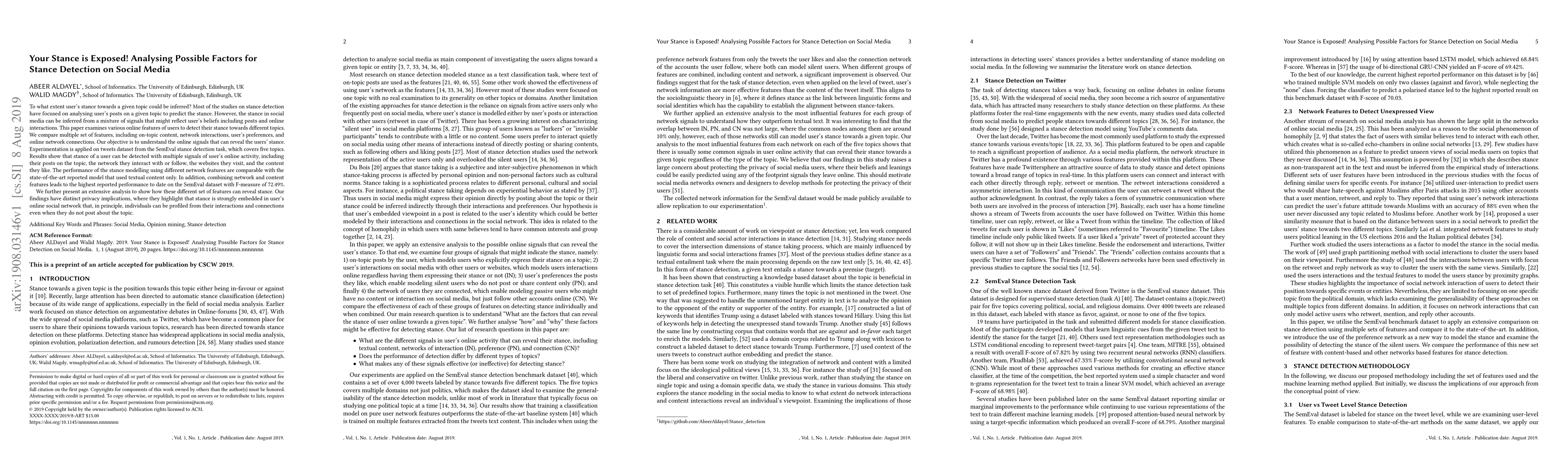 This paper investigates how users' stance on various topics can be inferred from a combination of online signals, including social media posts, network interactions, and online preferences. Experiments on a tweets dataset reveal that integrating network and content features achieves the best performance for stance detection, highlighting the privacy implications of profiling individuals based on their online social network activity.