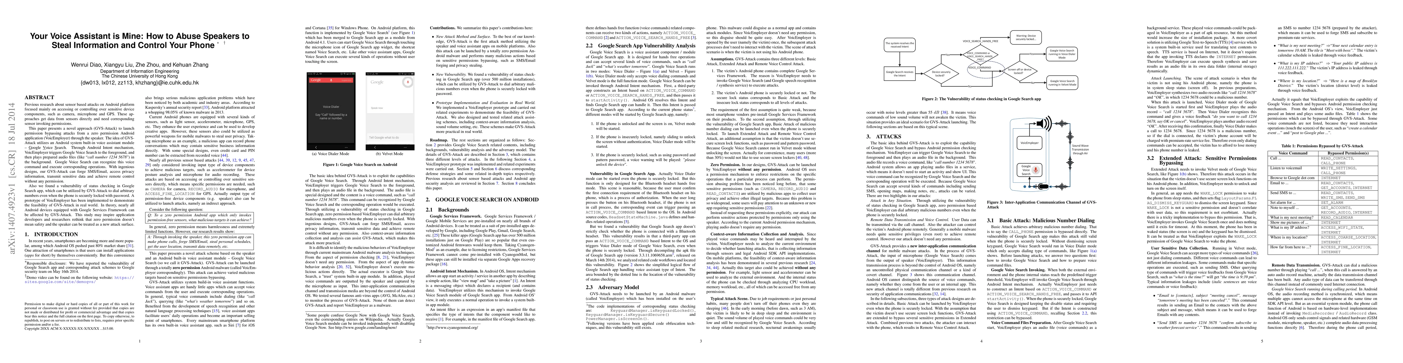 Previous research about sensor based attacks on Android platform focused mainly on accessing or controlling over sensitive device components, such as camera, microphone and GPS. These approaches get data from sensors directly and need corresponding sensor invoking permissions. This paper presents a novel approach (GVS-Attack) to launch permission bypassing attacks from a zero permission Android application (VoicEmployer) through the speaker. The idea of GVS-Attack utilizes an Android system built-in voice assistant module -- Google Voice Search. Through Android Intent mechanism, VoicEmployer triggers Google Voice Search to the foreground, and then plays prepared audio files (like "call number 1234 5678") in the background. Google Voice Search can recognize this voice command and execute corresponding operations. With ingenious designs, our GVS-Attack can forge SMS/Email, access privacy information, transmit sensitive data and achieve remote control without any permission. Also we found a vulnerability of status checking in Google Search app, which can be utilized by GVS-Attack to dial arbitrary numbers even when the phone is securely locked with password. A prototype of VoicEmployer has been implemented to demonstrate the feasibility of GVS-Attack in real world. In theory, nearly all Android devices equipped with Google Services Framework can be affected by GVS-Attack. This study may inspire application developers and researchers rethink that zero permission doesn't mean safety and the speaker can be treated as a new attack surface.