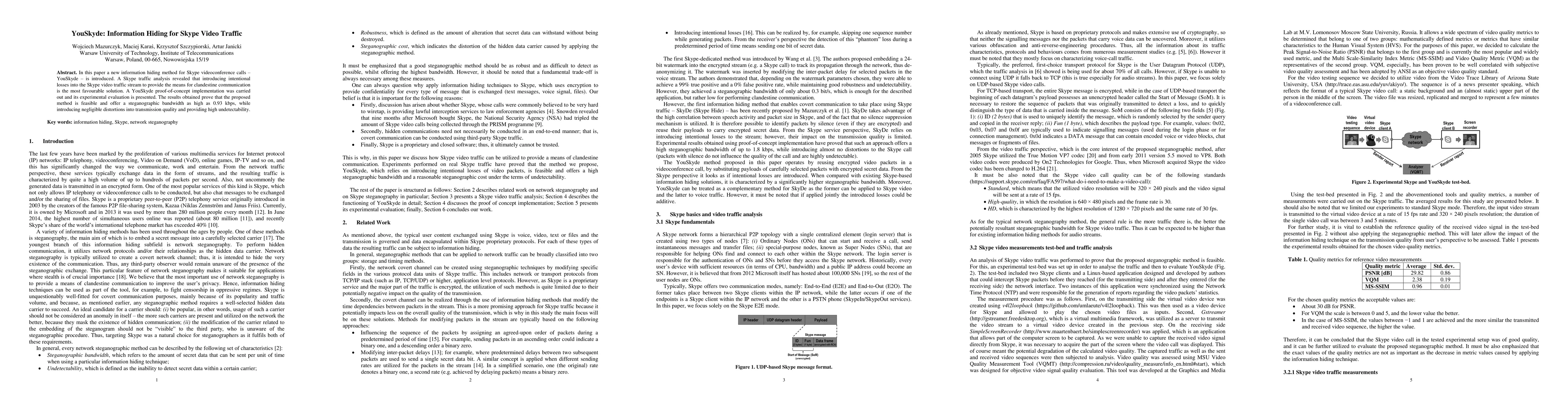 Title: YouSkyde: Information Hiding for Skype Video Traffic Summary: YouSkyde introduces a steganographic method for covert communication within Skype video calls by embedding data into intentional losses, achieving a bandwidth of 0.93 kbps with minimal impact on video quality and high undetectability.