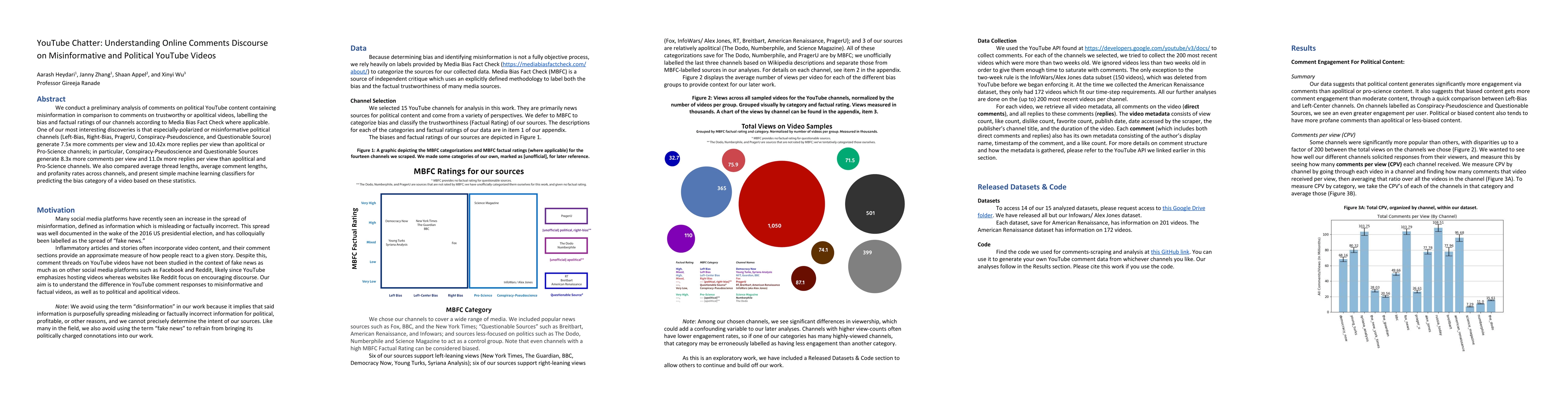 We conduct a preliminary analysis of comments on political YouTube content containing misinformation in comparison to comments on trustworthy or apolitical videos, labelling the bias and factual ratings of our channels according to Media Bias Fact Check where applicable. One of our most interesting discoveries is that especially-polarized or misinformative political channels (Left-Bias, Right-Bias, PragerU, Conspiracy-Pseudoscience, and Questionable Source) generate 7.5x more comments per view and 10.42x more replies per view than apolitical or Pro-Science channels; in particular, Conspiracy-Pseudoscience and Questionable Sources generate 8.3x more comments per view and 11.0x more replies per view than apolitical and Pro-Science channels. We also compared average thread lengths, average comment lengths, and profanity rates across channels, and present simple machine learning classifiers for predicting the bias category of a video based on these statistics.